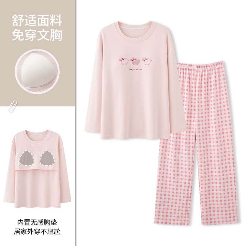 2025新型春秋パジャマ女性長袖胸パッド付き100% 純綿甘美で可愛い家庭服カジュアルセット