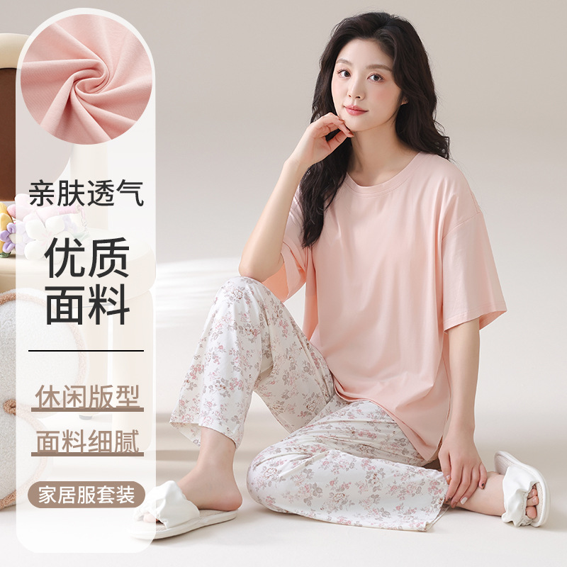 女性用サマーパジャマ、モーダル半袖ズボンスーツ、シンプルでカジュアル、屋外で着用可能、夏用の薄手で涼しいホーム服