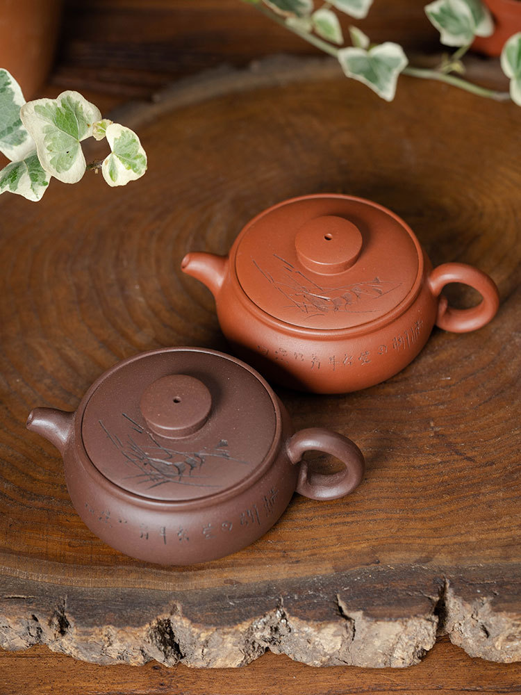 宜興手作業彫刻周婷朱泥壺紫砂壺紫泥壺小容量大開放カンフー茶具急須