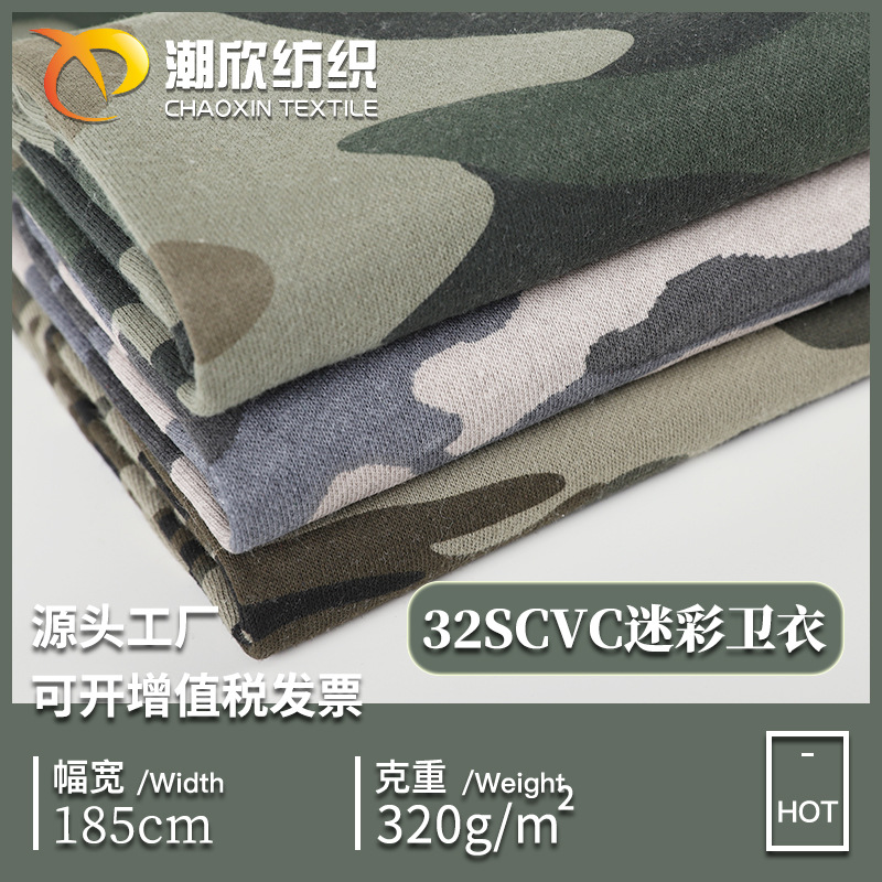 32scvc迷彩プリントのパーカー生地320gのパーカーのニット生地のポリエステルの毛輪の布の現物