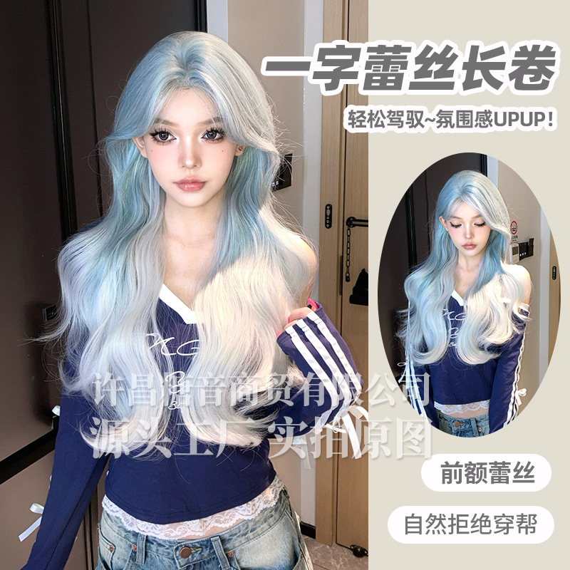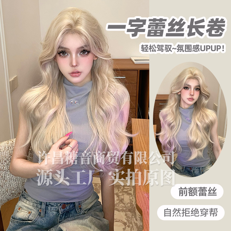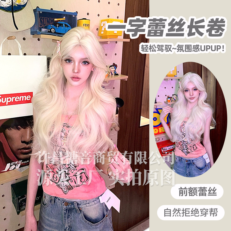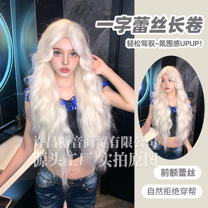 砂糖の音のかつらの夏の新型の1字のレースの長い巻き髪の全頭カバーの自然な丸い顔の韓国式のかつら