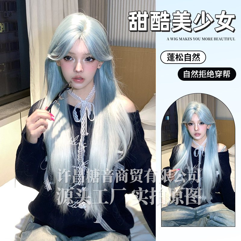 ロングカーリーヘアの女性用シュガーカラーウィッグ、ロリータ風リアルな韓国風前髪、エッグカールウィッグ、フルヘッドウィッグ