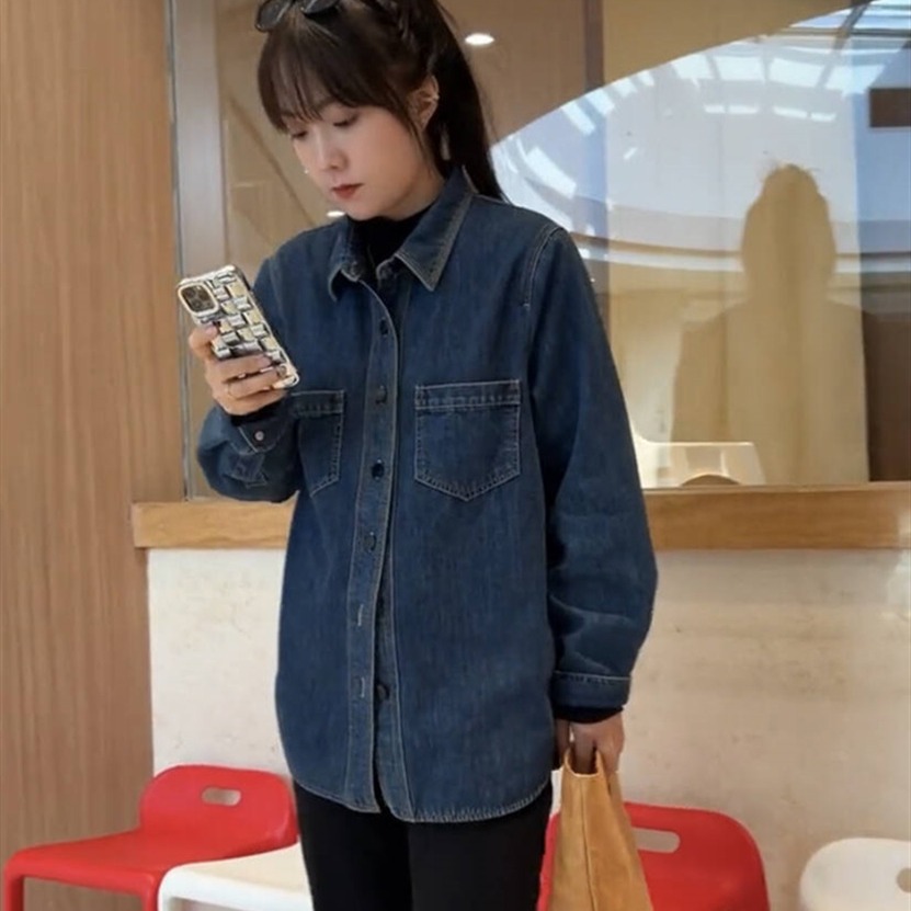 ベルベットの厚いデニムシャツのコートの女性の長袖2023秋冬の新しいゆるいカジュアルシャツは、痩せた上着を着ています