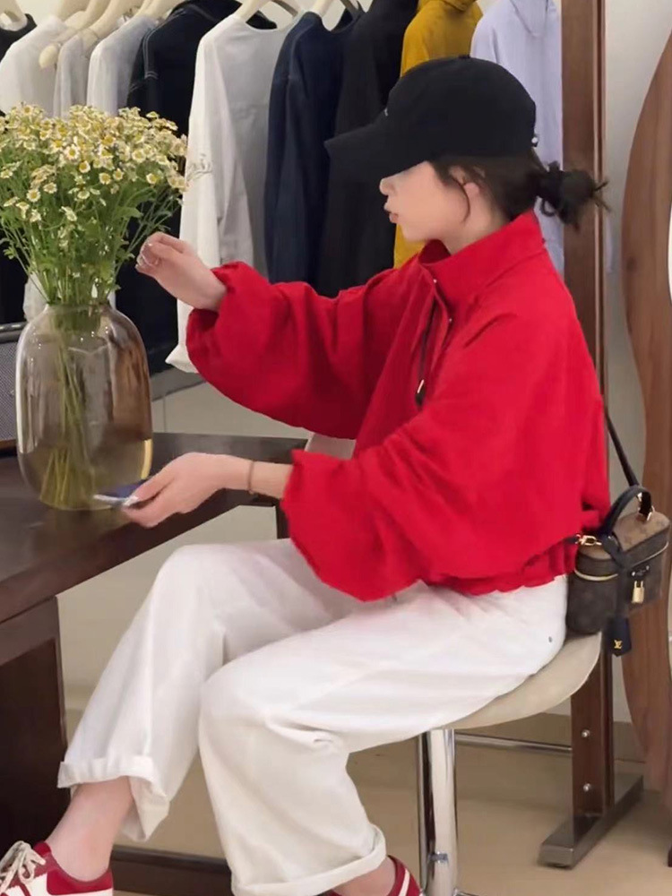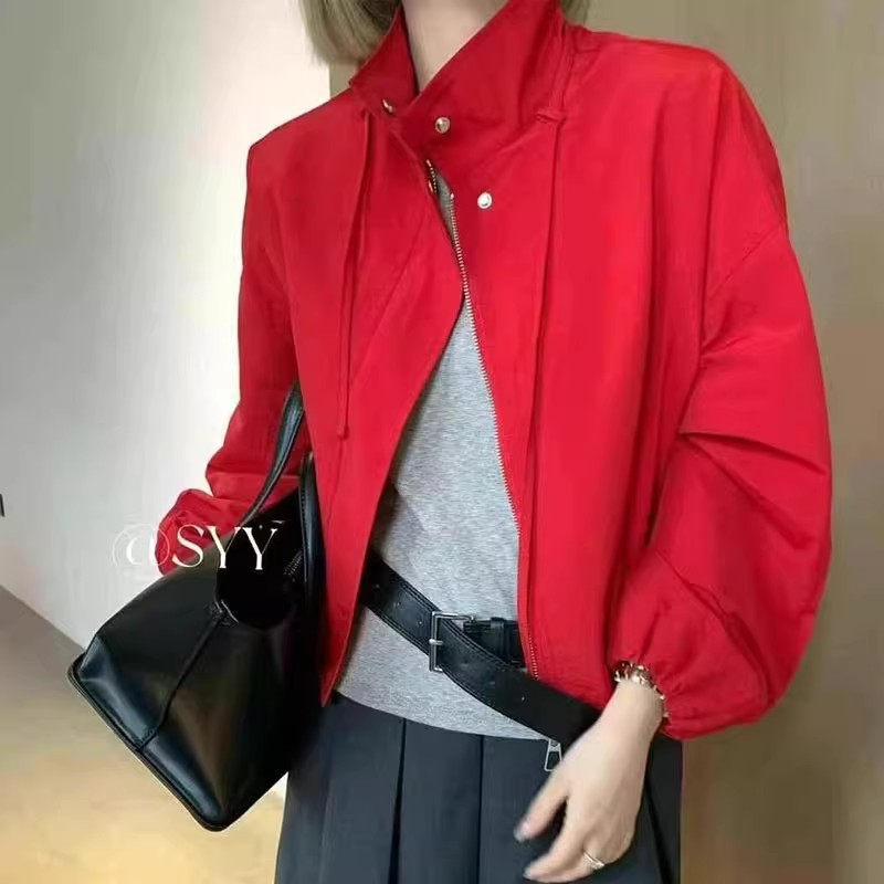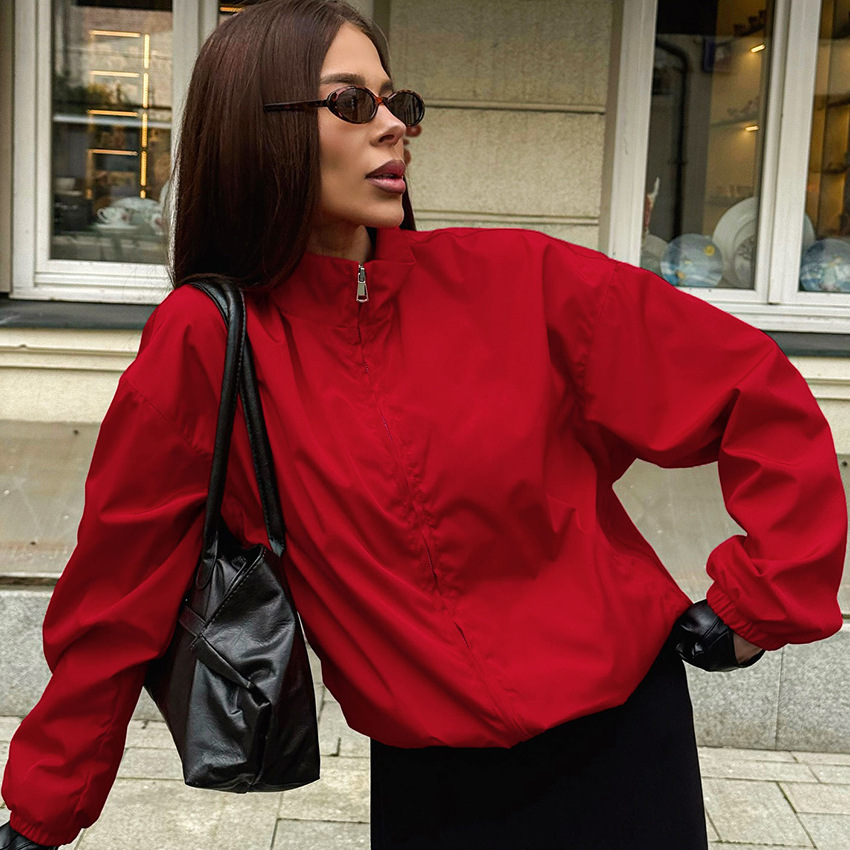 秋冬新款欧美风红色立领拉链防风外套设计感气质时尚2025跨境通勤
