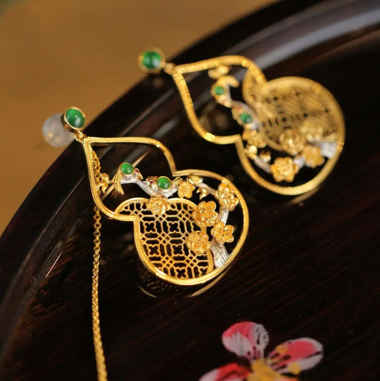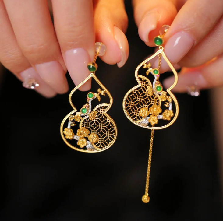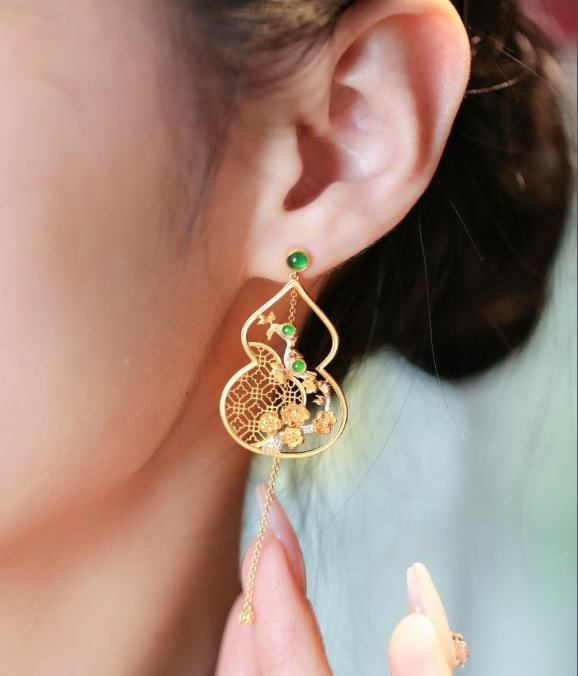 民族古典翡翠色ひょうたん花窓イヤリング非対称AB型ピアス古風優雅イヤリング中国式イヤリング