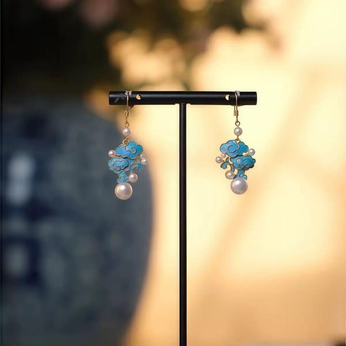 古代の青い模造点翠祥雲イヤリング女性のレトロな中国風エナメルパールイヤリング漢服チャイナドレスマッチング
