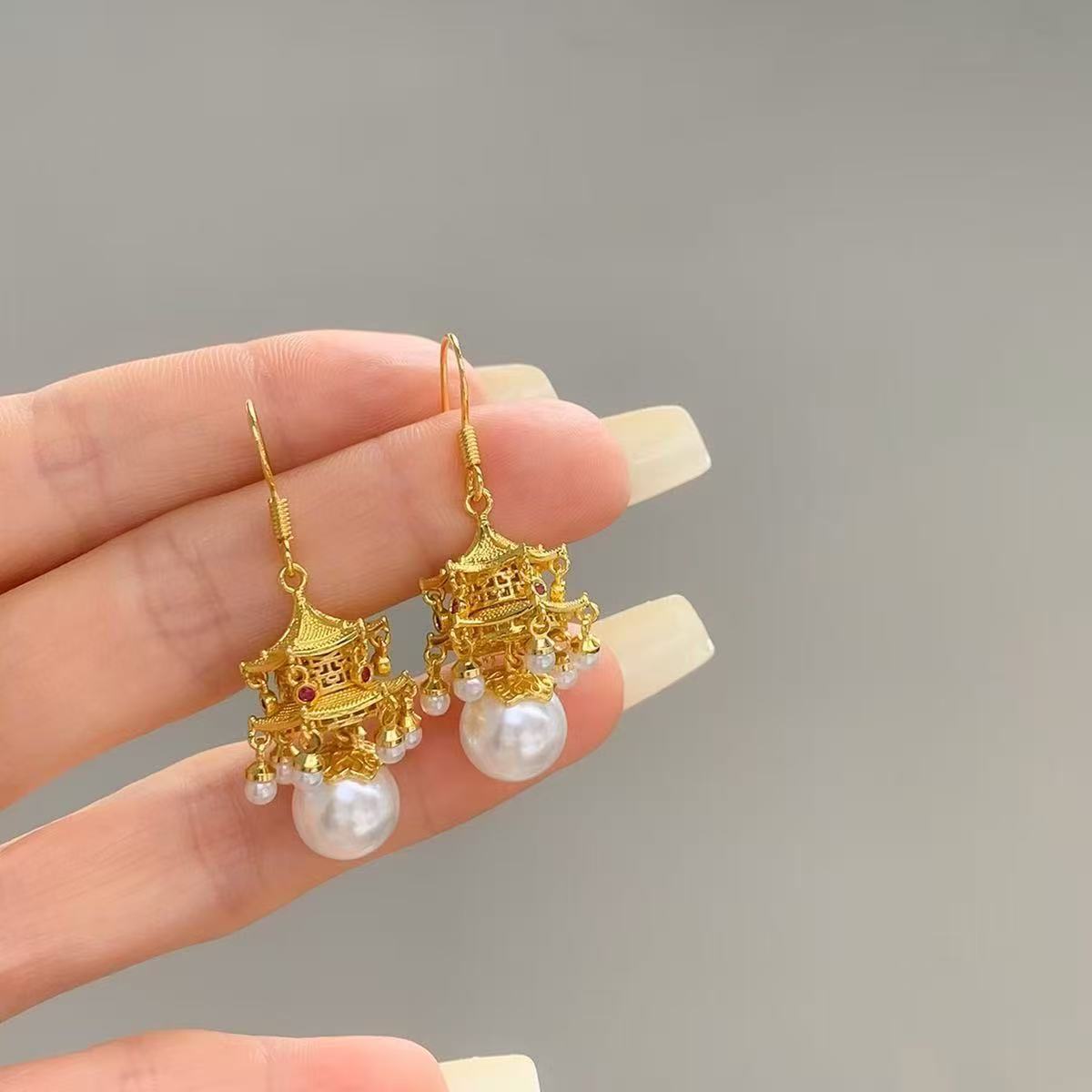新中式国潮宫廷风金色亭台楼阁珍珠耳坠文艺复古小众设计高级耳饰