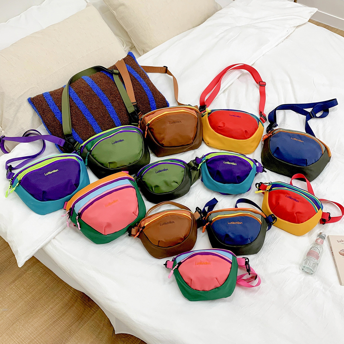 子供用斜め掛けミニバッグ、おしゃれな配色と文字入り、男女兼用ウエストバッグ、2025年新作、ベビー用小銭入れアクセサリーバッグ、トレンド