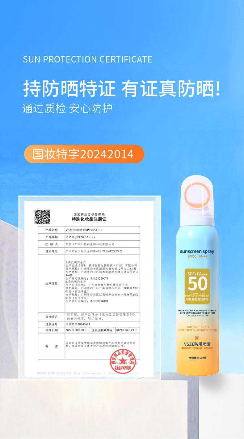 VSZEスモール绞りSPF50美白日焼け止めスプレーuvカット防水汗対策全身アウトドア