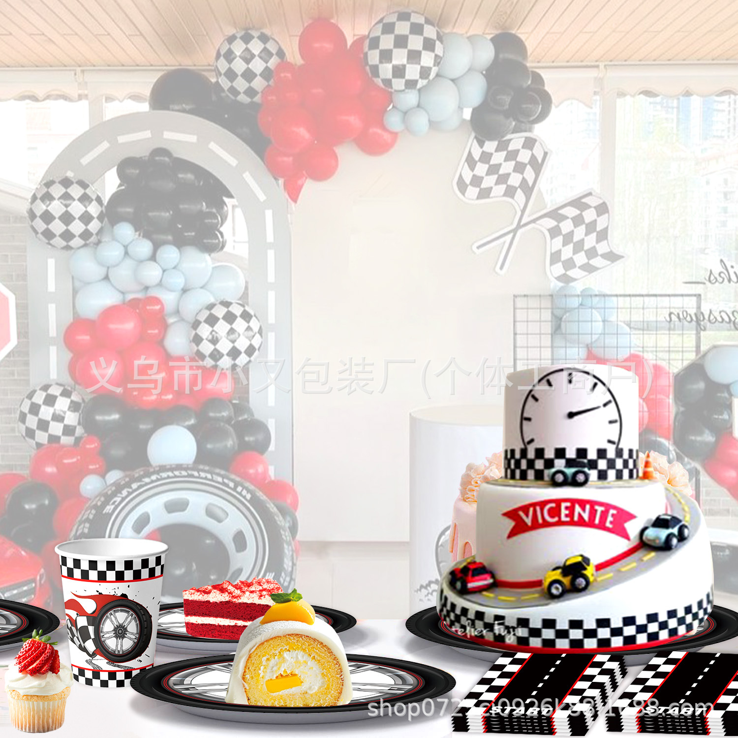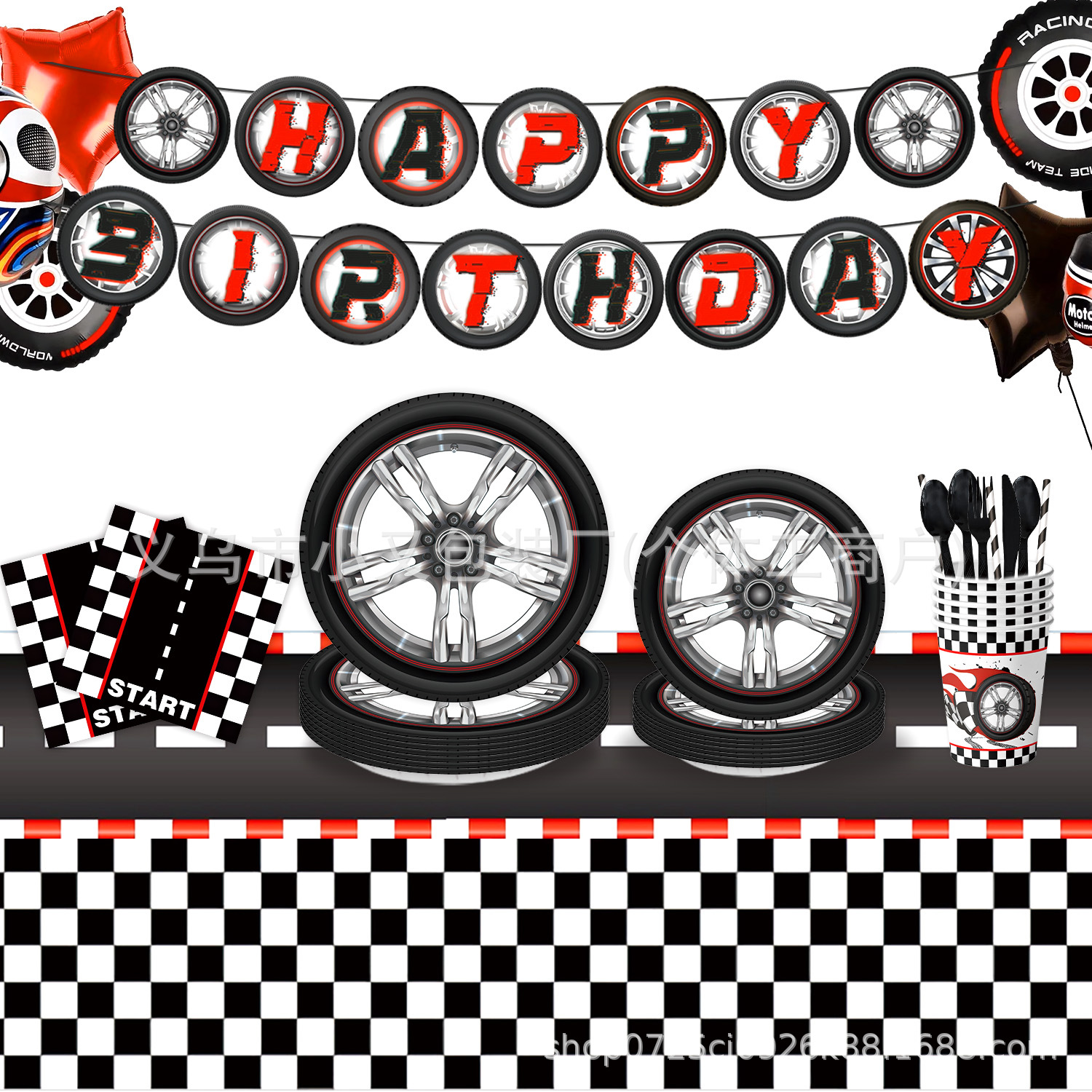 クロスボーダーレーシングホイールスポーツカーのテーマ男の子誕生日パーティー使い捨て紙皿紙コップ旗テーブルクロス用品