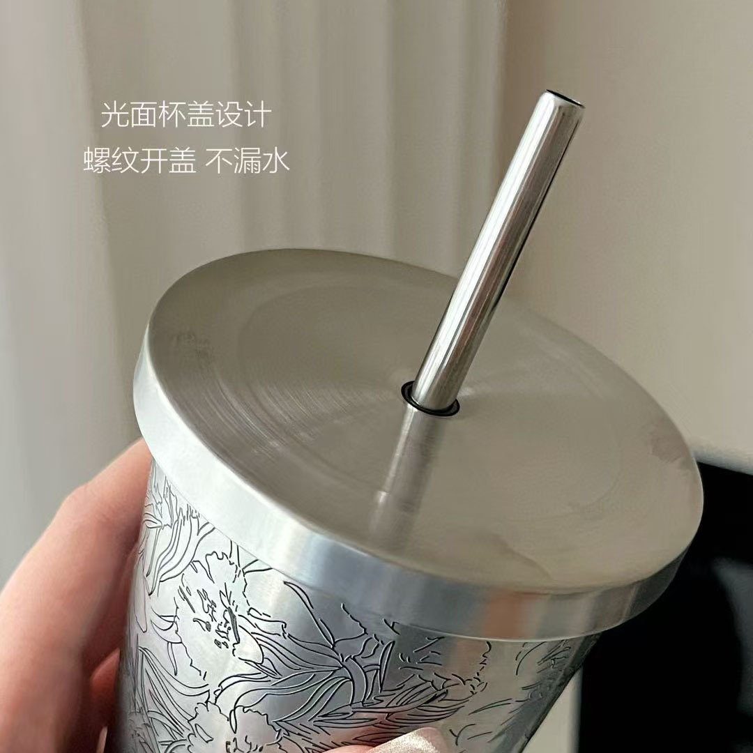 新しいダブルドリンク Brutalist コーヒーカップヒョウ柄車載大容量ストロー 473 ミリリットルステンレス鋼ポータブル魔法瓶カップ
