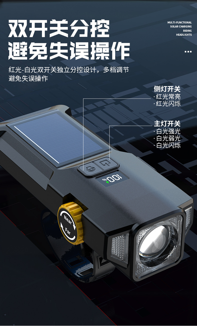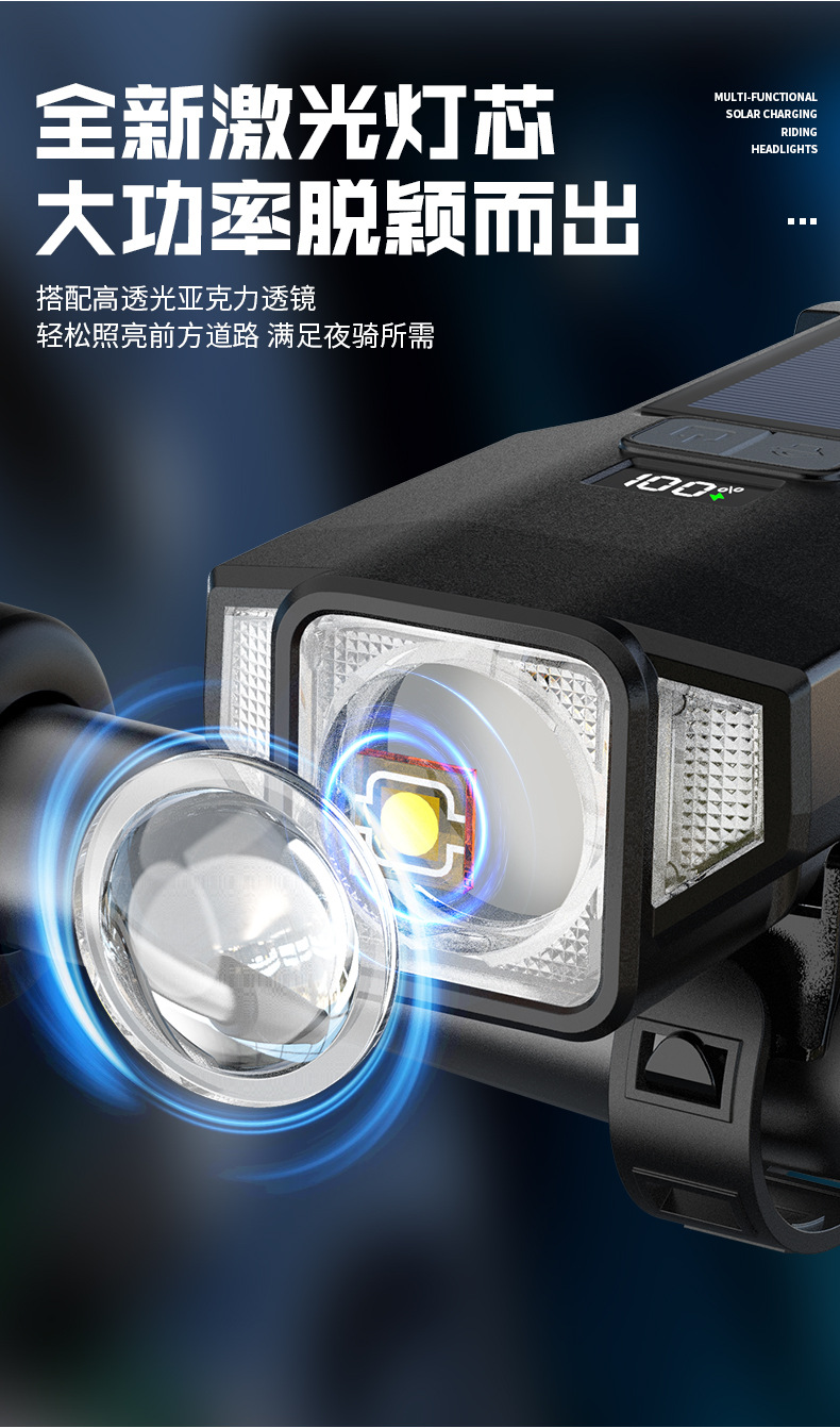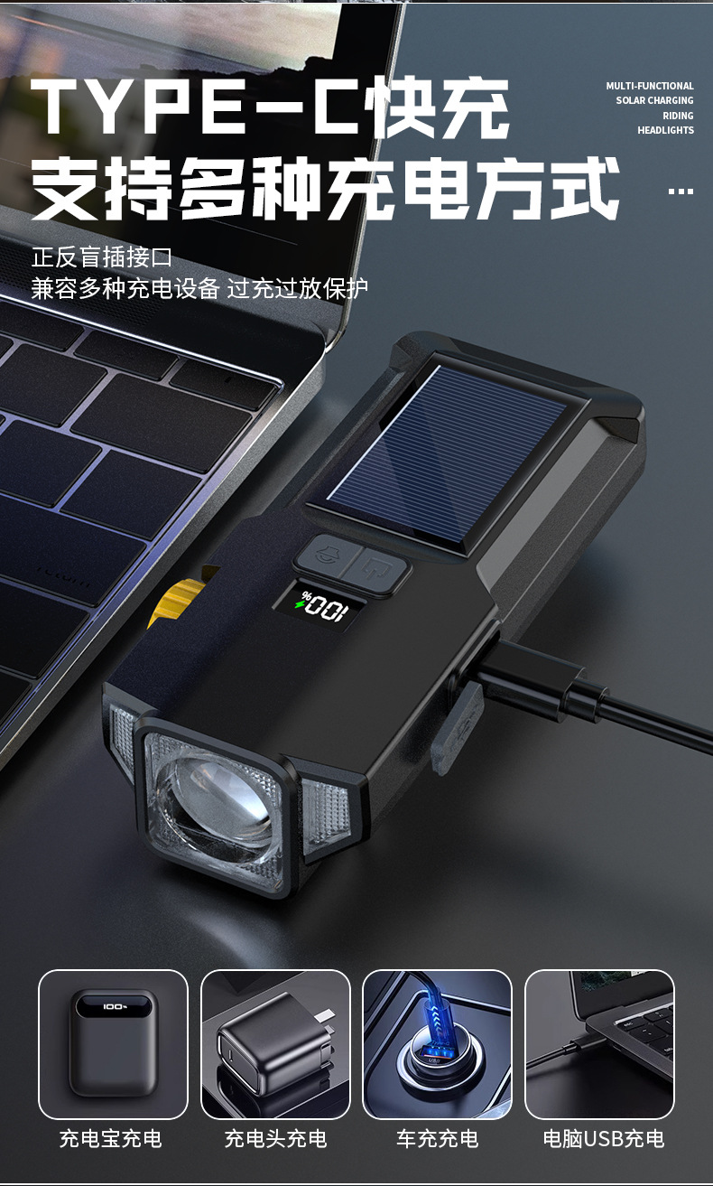数显骑行车灯Tpye-C充电户外高亮太阳能数字白激光照明自行车前灯