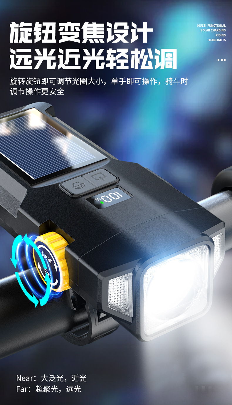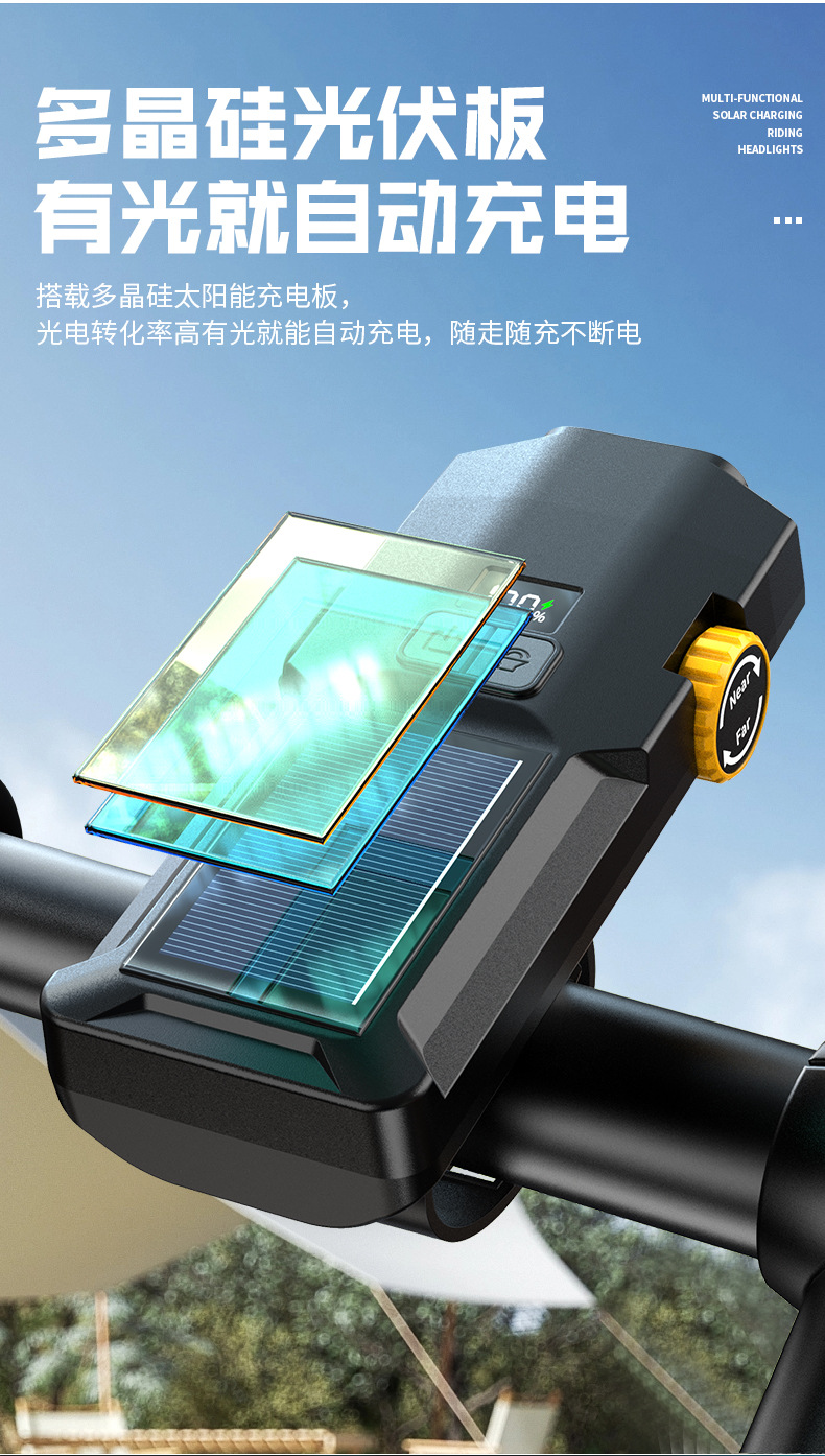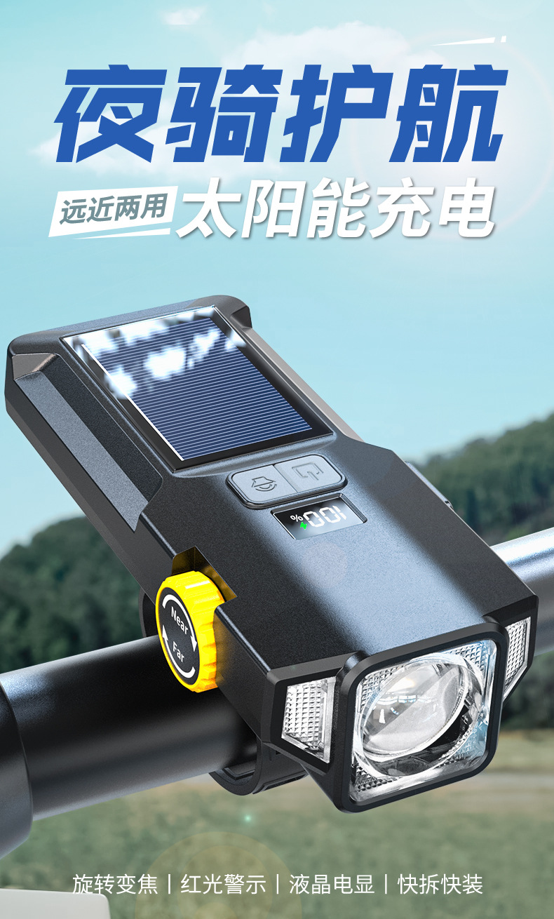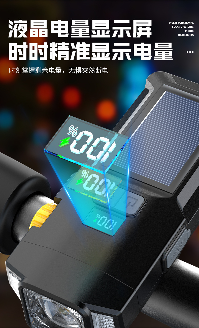 新款夜骑护航电量显示强光骑行太阳能充电高亮远射防雨自行车前灯