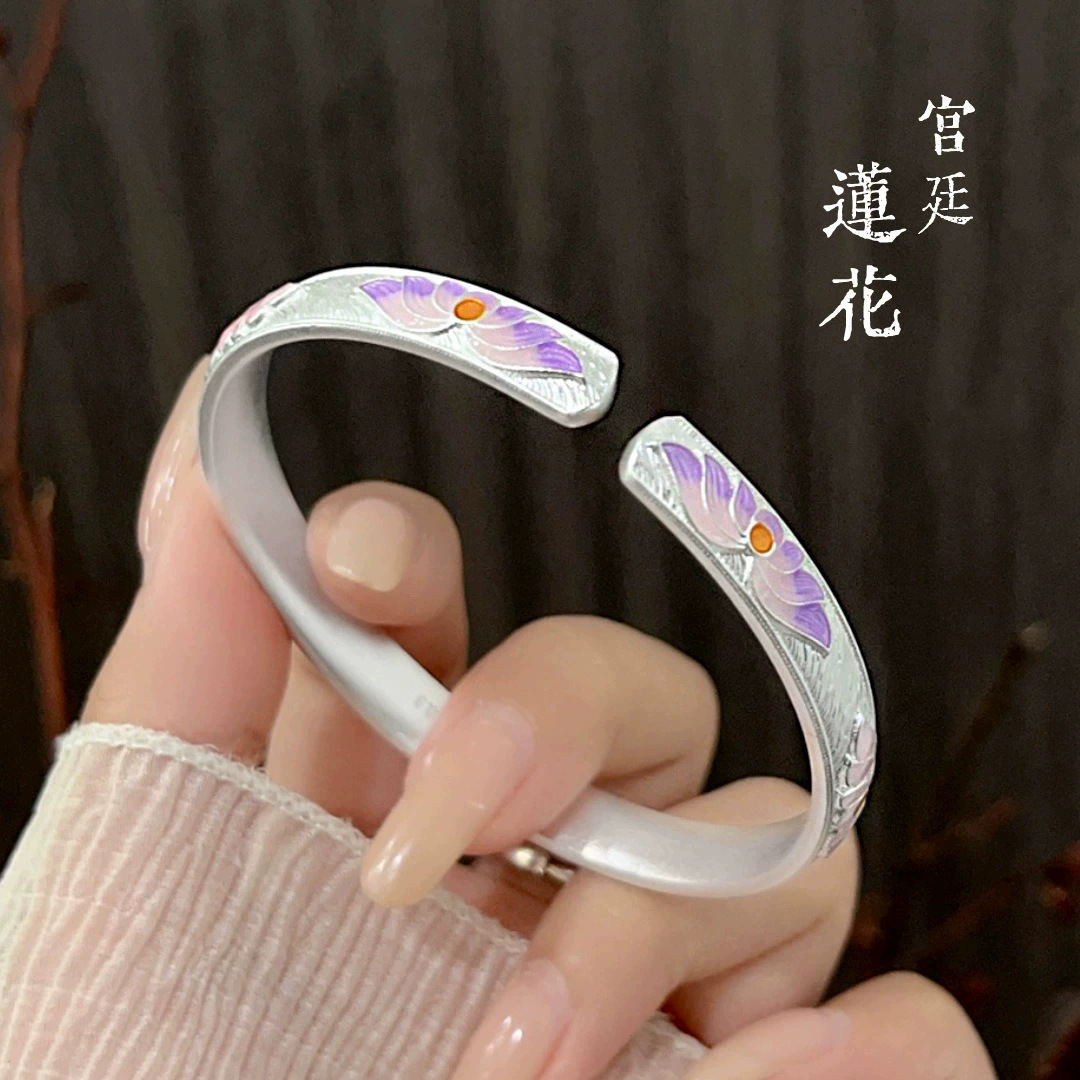 宫廷风珐琅莲花手镯开口实心古法手环复古年轻款镯子百搭直播爆款