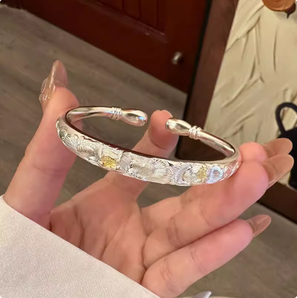 新款牡丹花开口手镯新中式圆棍国风小众时尚百搭感精致饰品送礼物