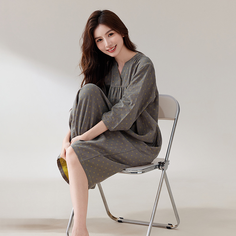 2025秋冬新款100纯棉女士睡裙中长款开衫舒适透气睡衣春秋家居服
