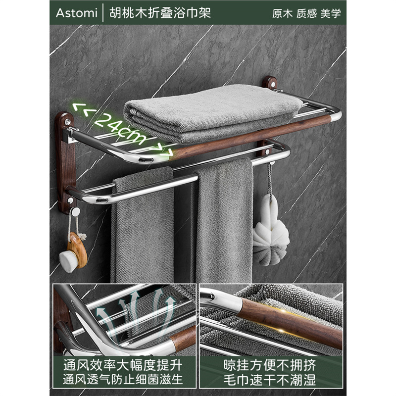 胡桃木卫生间毛巾架不锈钢免打孔浴巾架卫生间高端浴室置物架