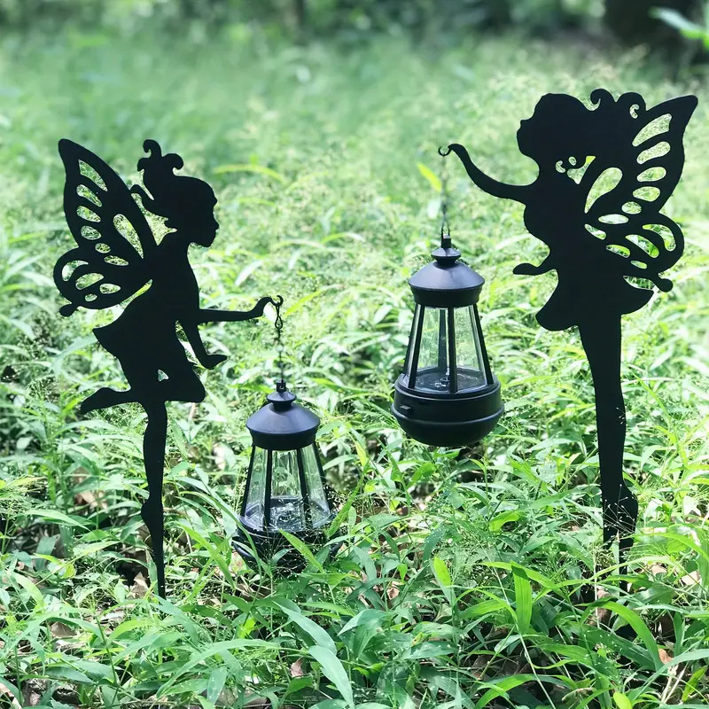 屋外のシルエットの太陽エネルギーの鉄の芸の花園の庭の明かりの花の猫の花の仙子の地は鉄の芸の透かし彫りの花の仙子の明かりを挿し込みます。