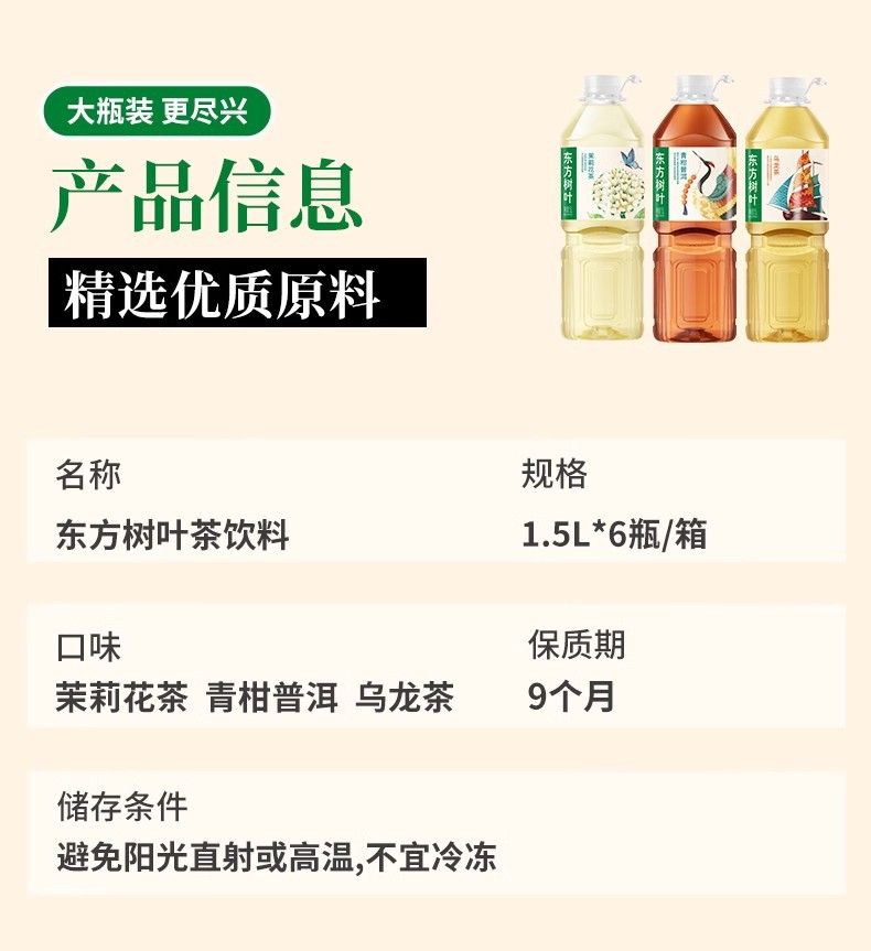 农夫山泉东方树叶无糖茶饮料1.5L*6瓶整箱大瓶茉莉花茶分享装整箱