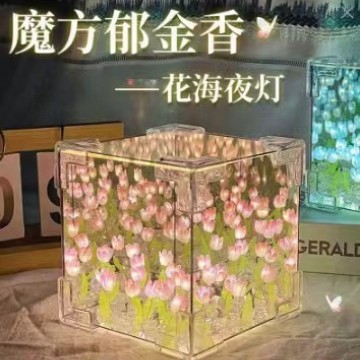 新品魔方郁金香diy手工灯 亚克力镜片镜子花海立体长方体小夜灯