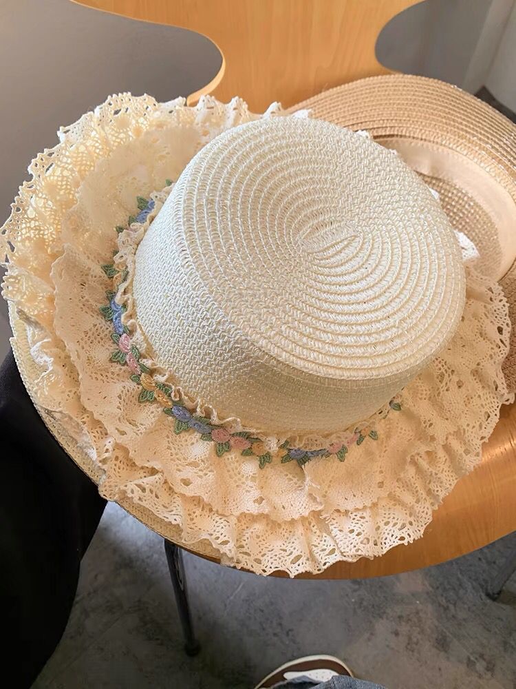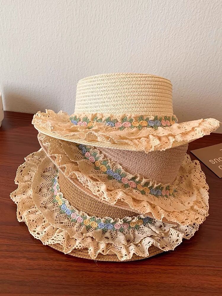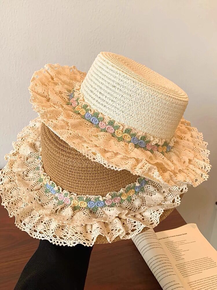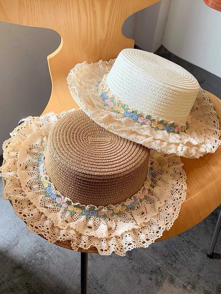 フランスの花レースの縁の麦わら帽子の女性の夏の大きいつばの平頂の帽子の海辺の砂浜の草は日焼け止めの日よけの帽子を編みます。