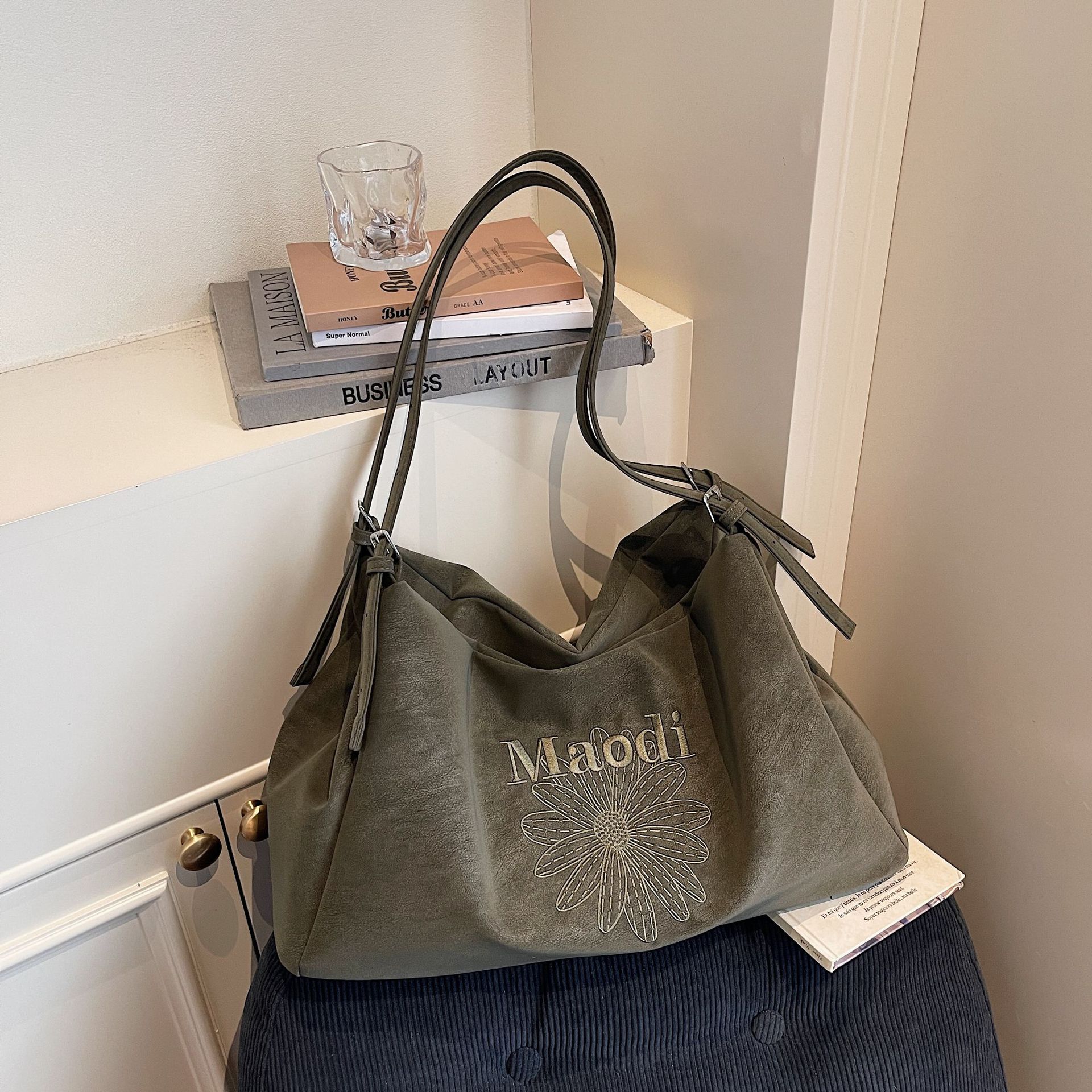 复古韩系大容量麂皮绒花朵刺绣单肩包高级质感洋气时尚腋下托特包