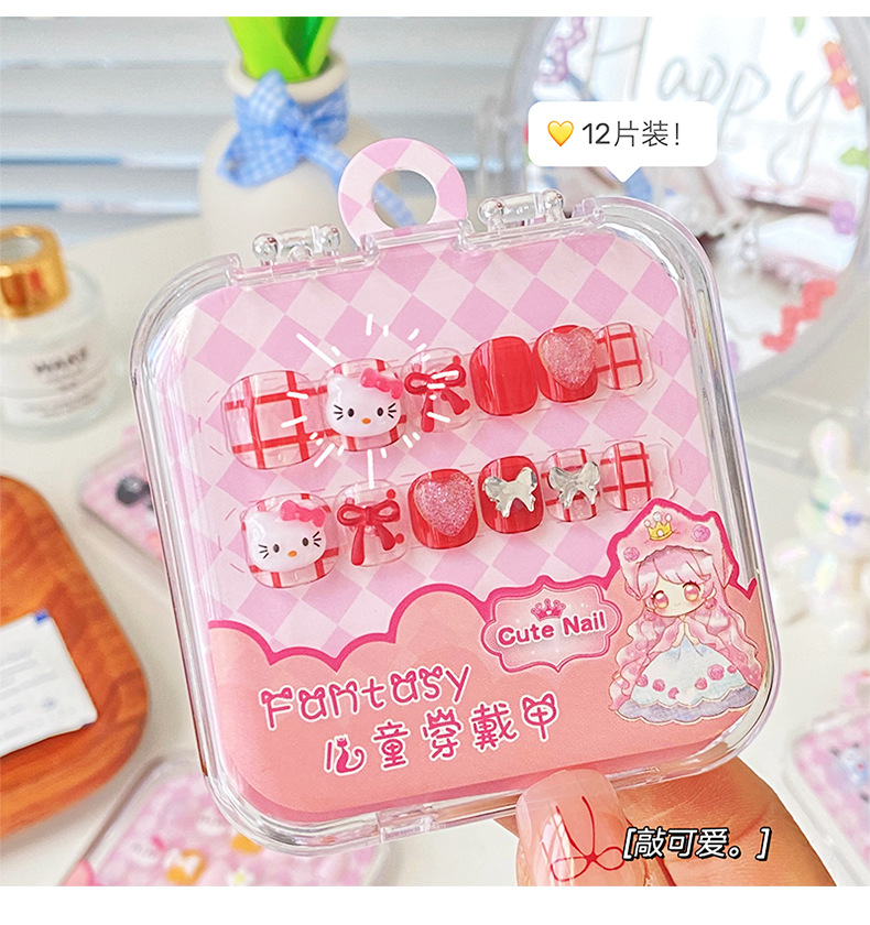 儿童卡通KT猫穿戴甲片新年款红色小女孩美甲贴指甲贴果冻胶可拆卸