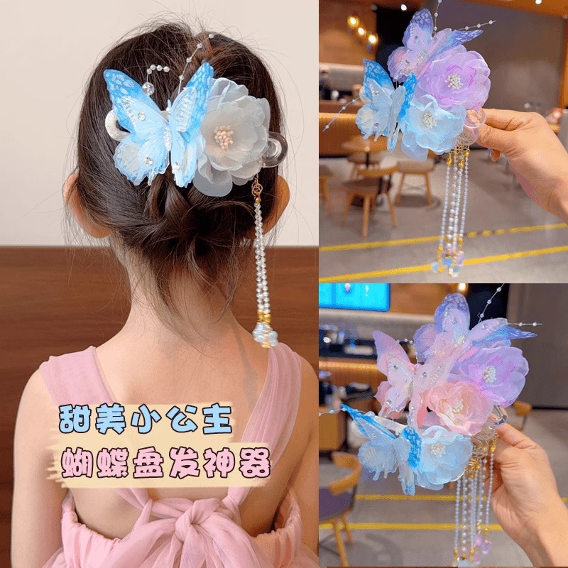 女性用漢服帽子、甘い蝶と花のタッセルクリップ、小さな女の子のボールヘアアーティファクト、髪を傷つけない帽子