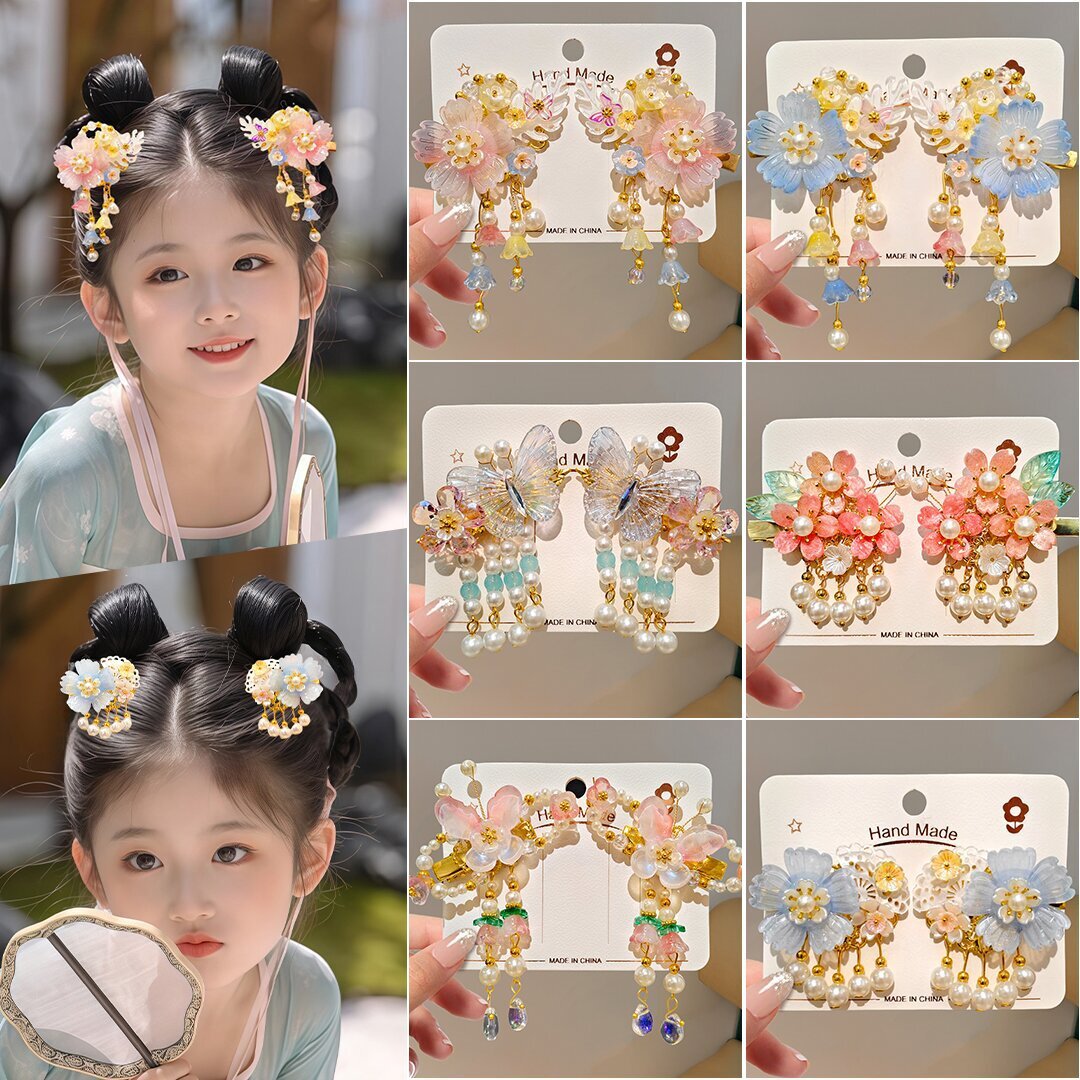 新中式漢服超仙気ヘアピン 女児用ヘアアクセサリー 古風な花柄タッセルパール 女児用ヘアピン 甘いレトロ風