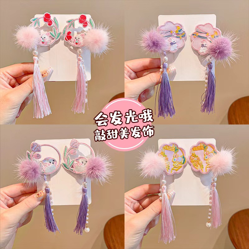 儿童发夹中式粉色月饼宝宝发光发饰儿童汉服古风毛绒流苏国风头饰