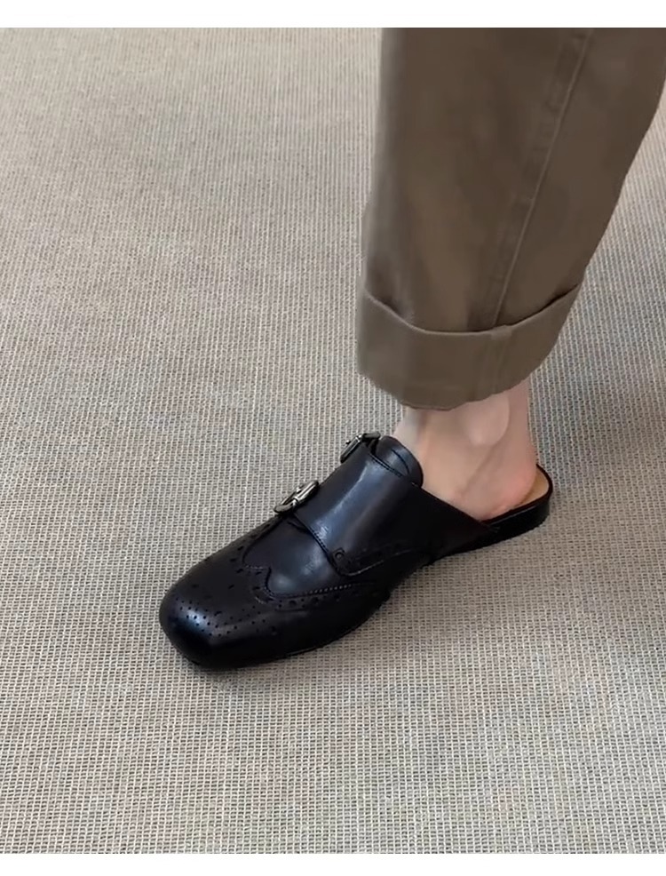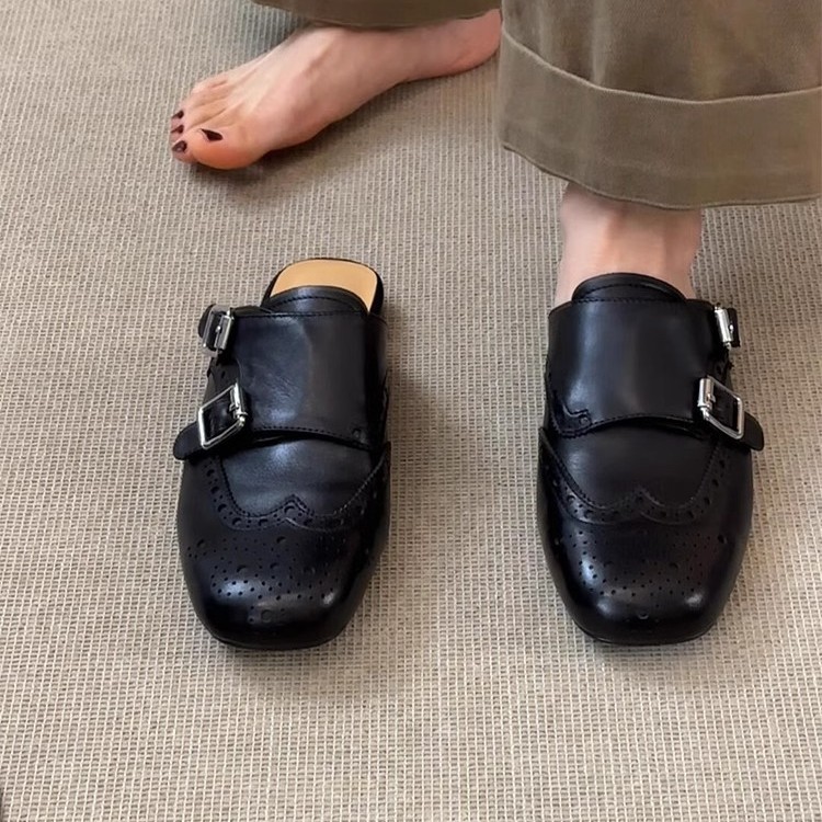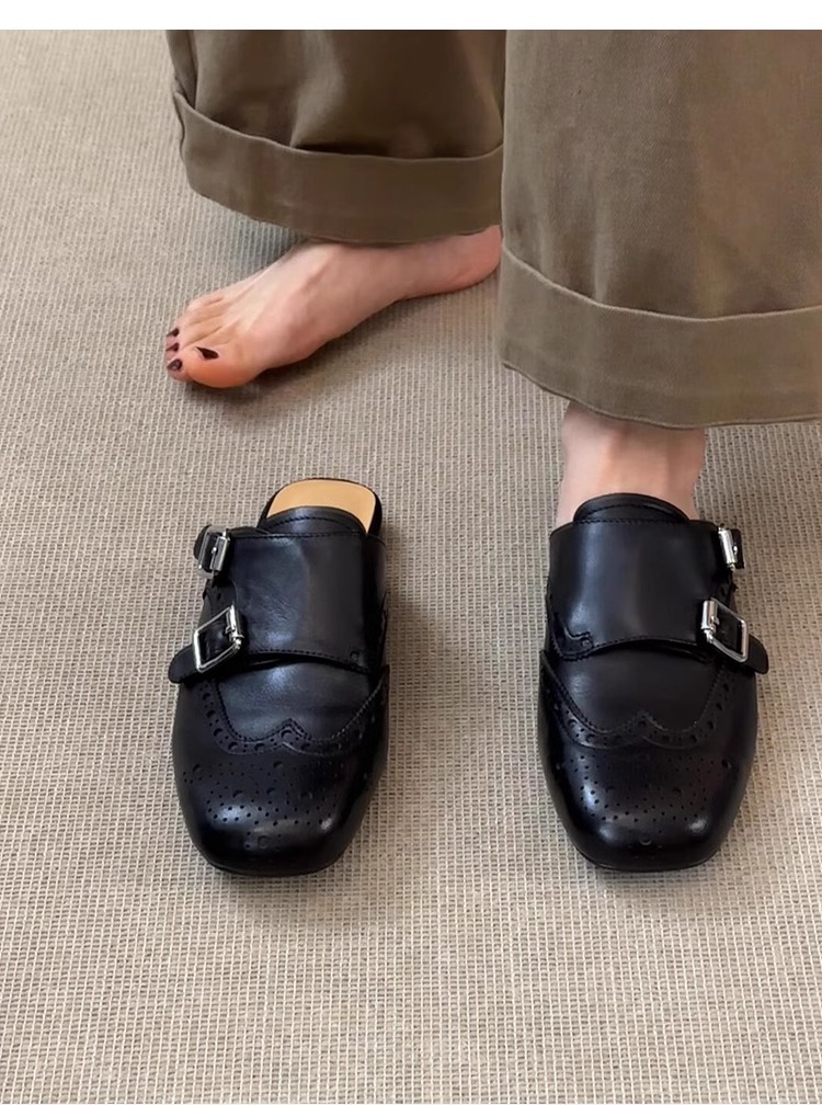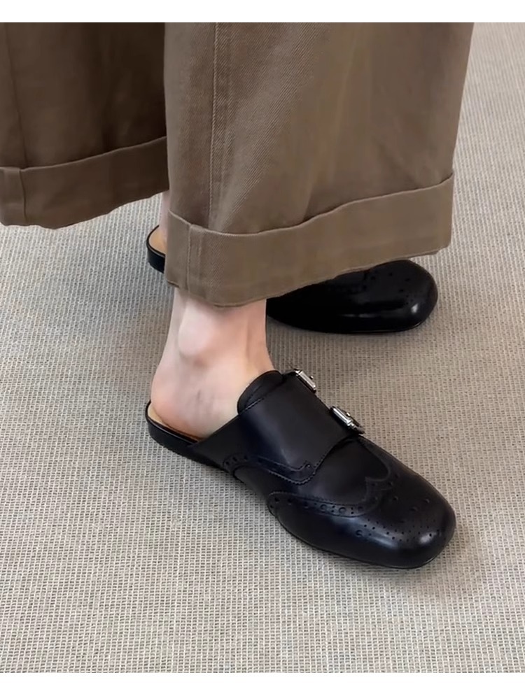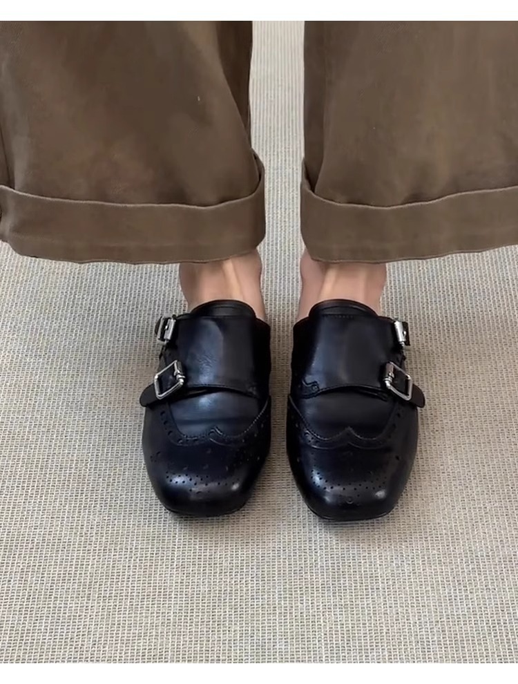 ソフトレザー版~スリッポン、ダブルボタン、ソフトレザー、黒、包頭シューズ、レディース、レトロ、万能、スクエアトゥ、ブローグ、ハーフスリッパ