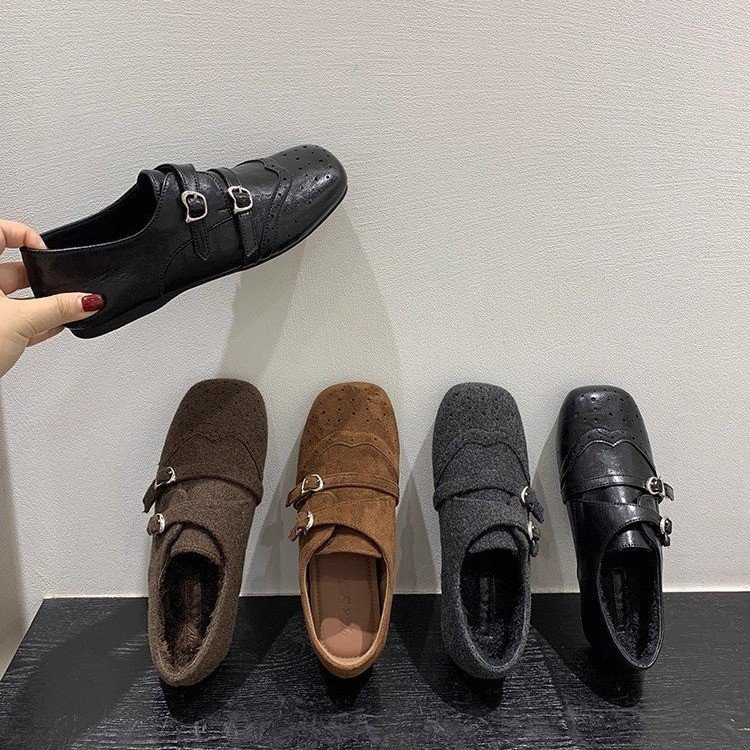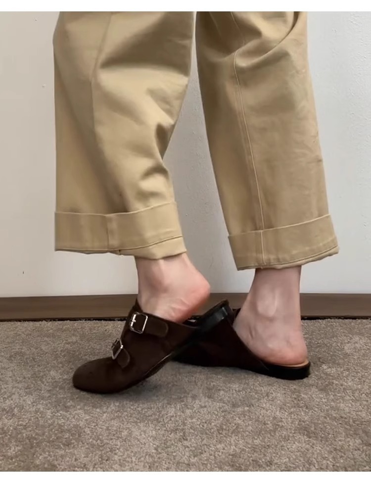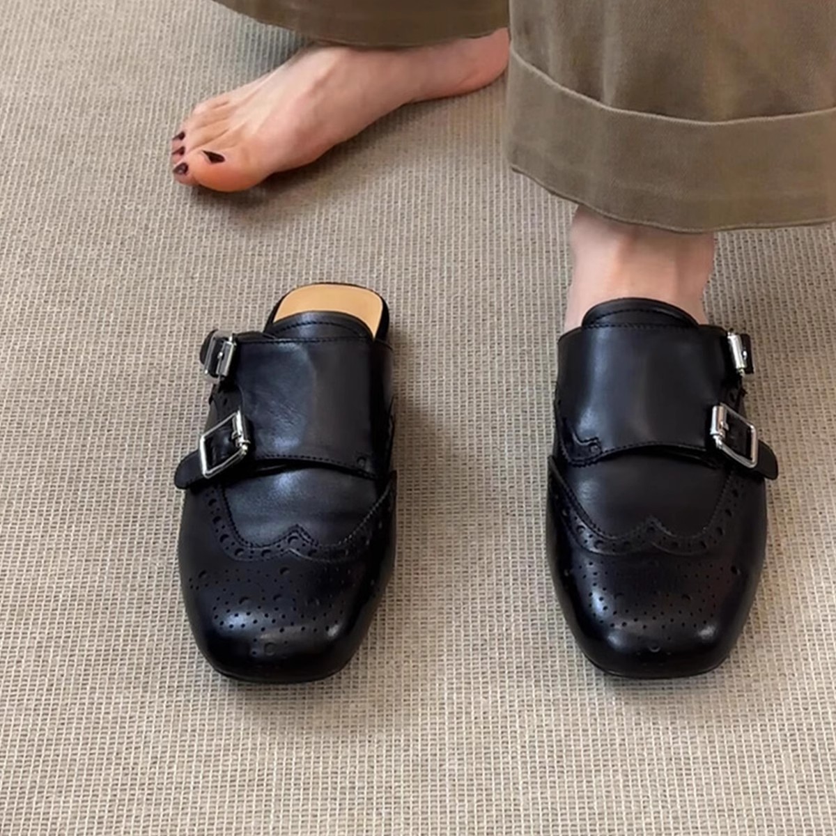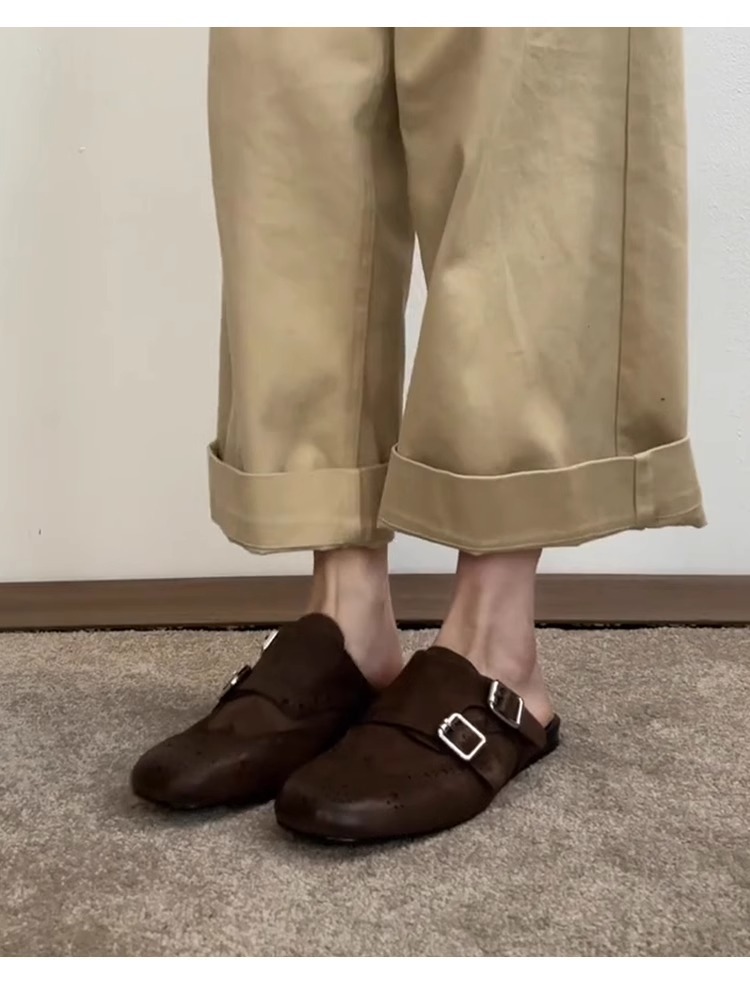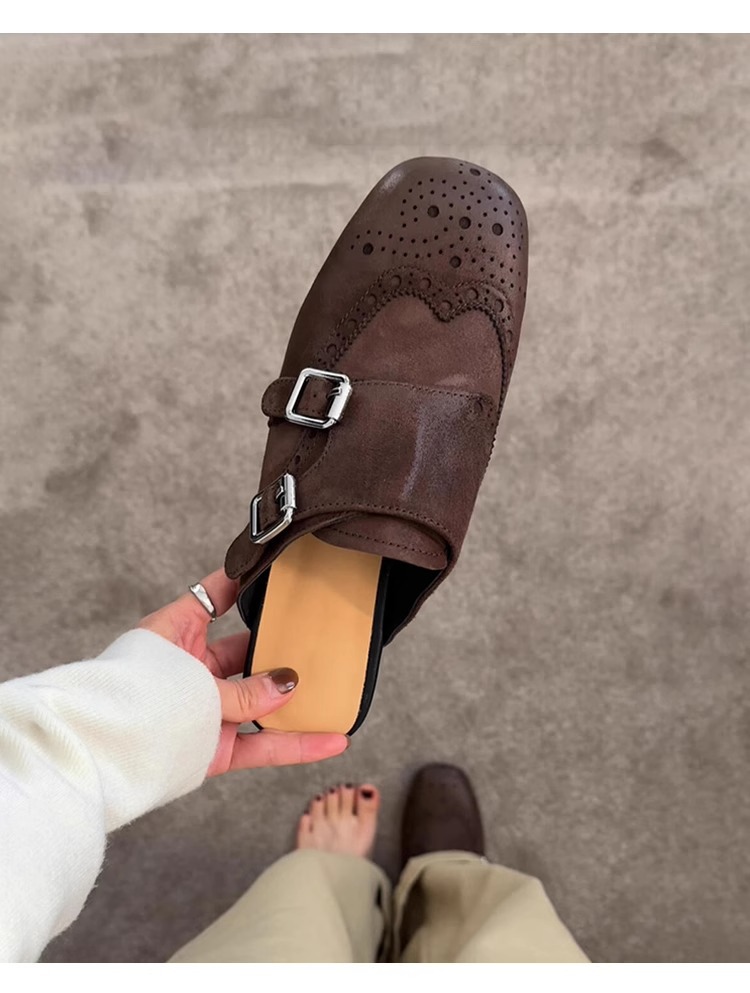 ソフトレザー版~スリッポン、ダブルボタン、ソフトレザー、黒、包頭シューズ、レディース、レトロ、万能、スクエアトゥ、ブローグ、ハーフスリッパ
