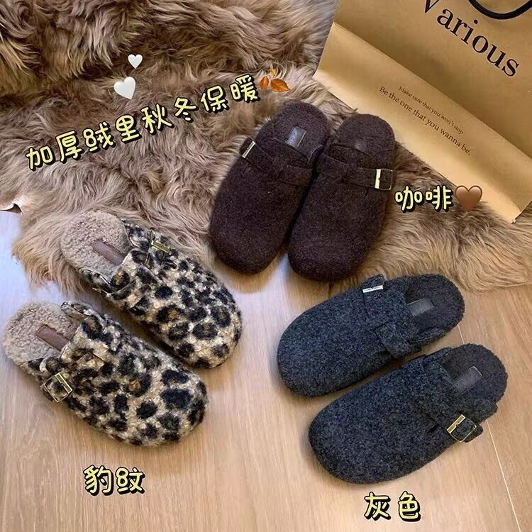 小众设计感豹纹毛毛鞋女外穿秋冬保暖包头半拖棉鞋厚底加绒勃肯鞋