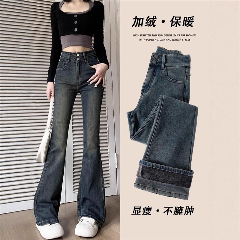 ストレートにベルベットをつけてジーンズを厚くした女性は冬に2024の新しい高腰ゆるい学生の広脚ズボンを着て保温する