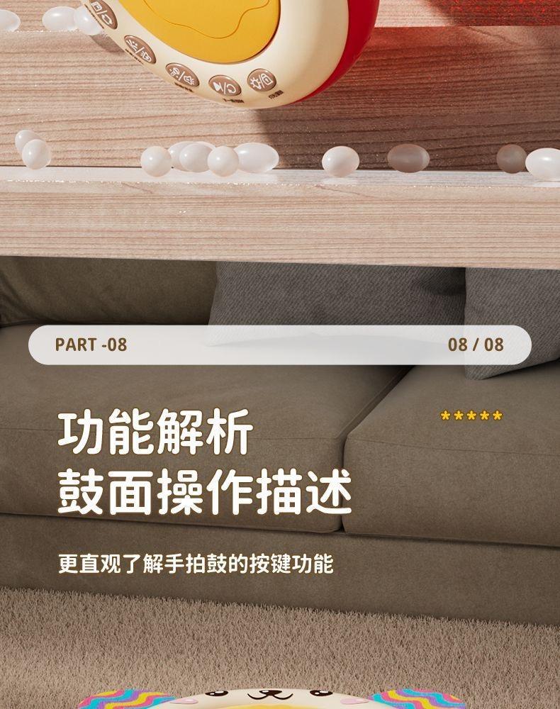 赤ちゃんの手で太鼓のおもちゃをたたいています。子供の早教益智充電多機能ストーリー機赤ちゃんの多面体は6-12ヶ月です。