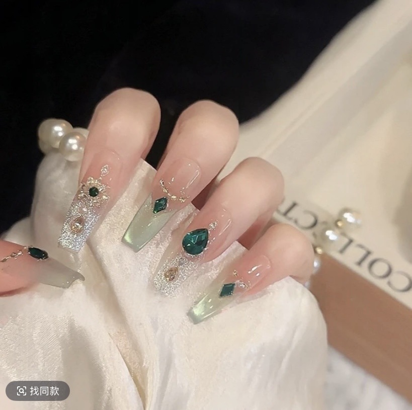 [アラジン] ライトラグジュアリーハンドメイドウェアラブルネイルレトロエメラルド宮殿スタイルハイエンドキャットアイ純粋な手作りマニキュア