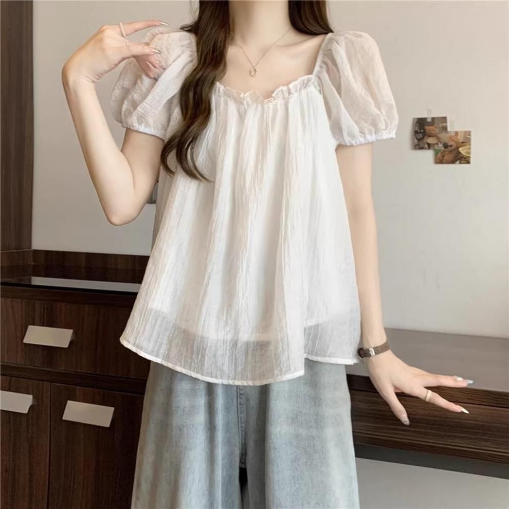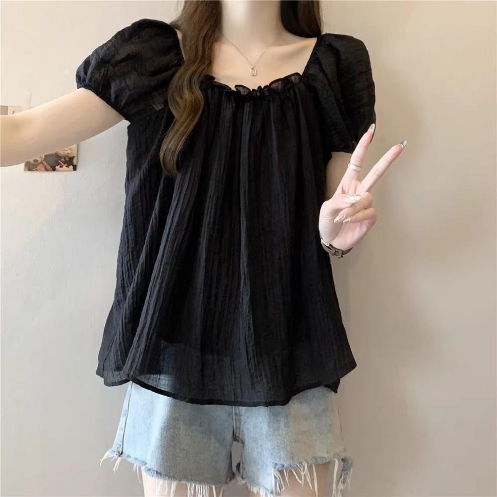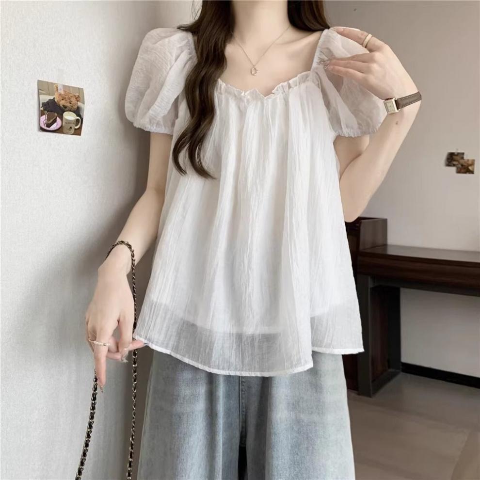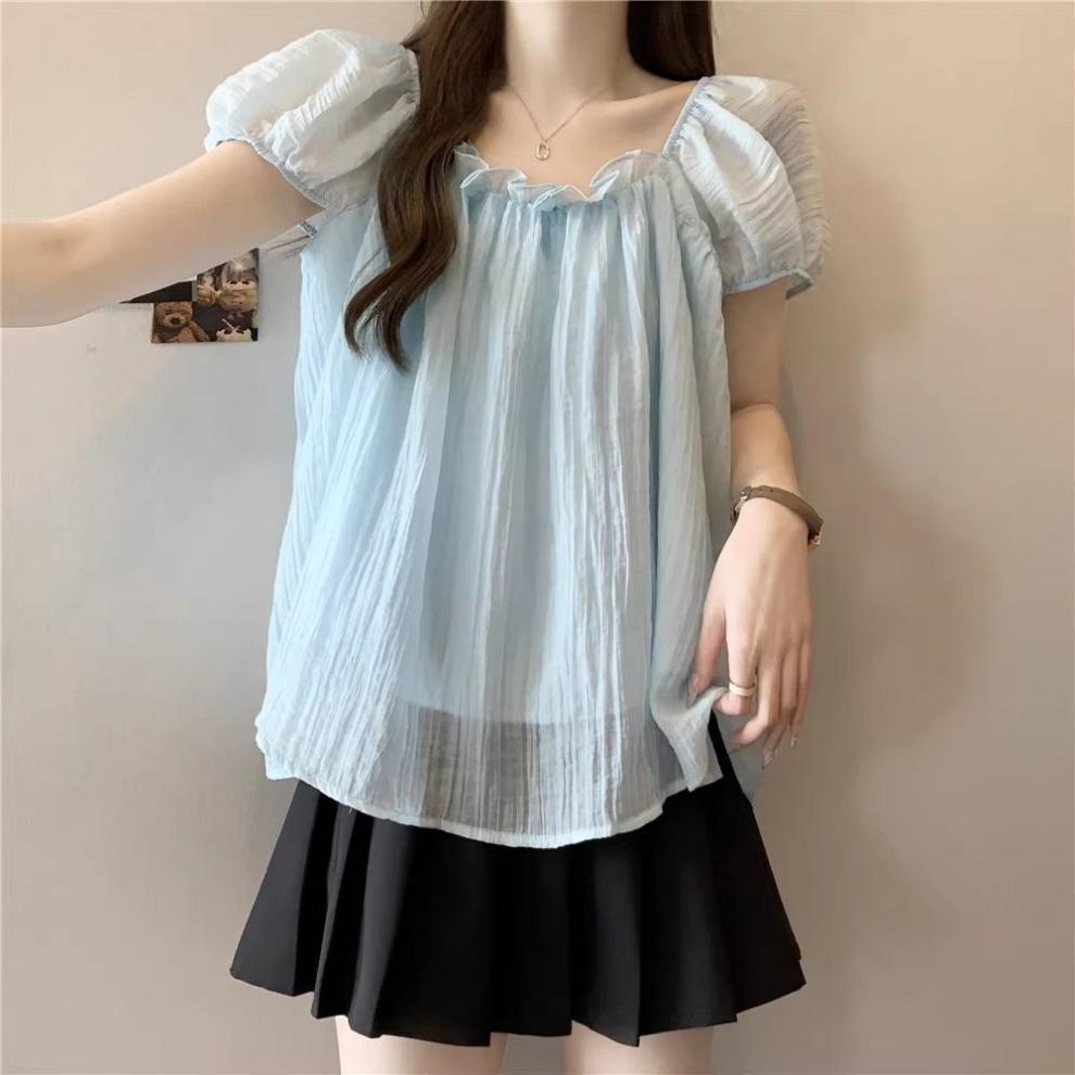 大きいサイズの婦人服の太ったmmの夏の薄い泡の袖のシフォンのシャツの上着の2025新型のヨーロッパの商品の小さいシャツは肉のシャツを遮ります