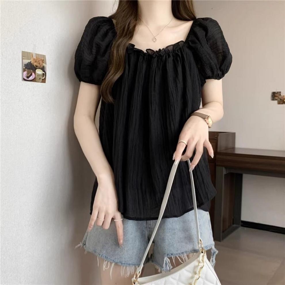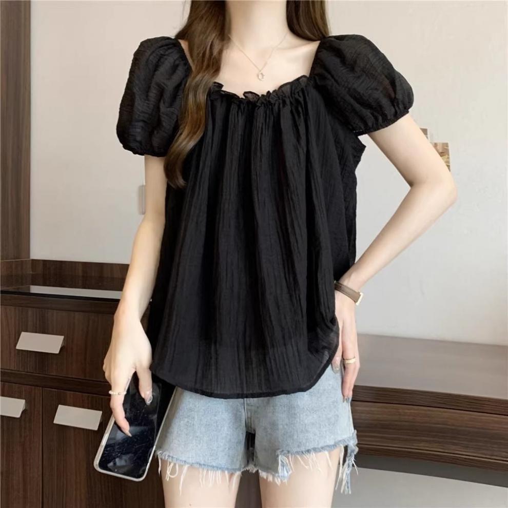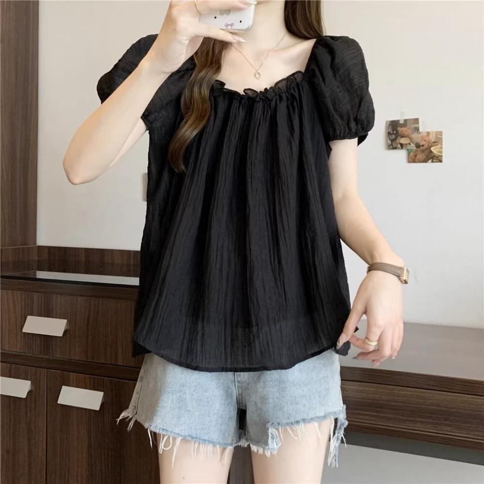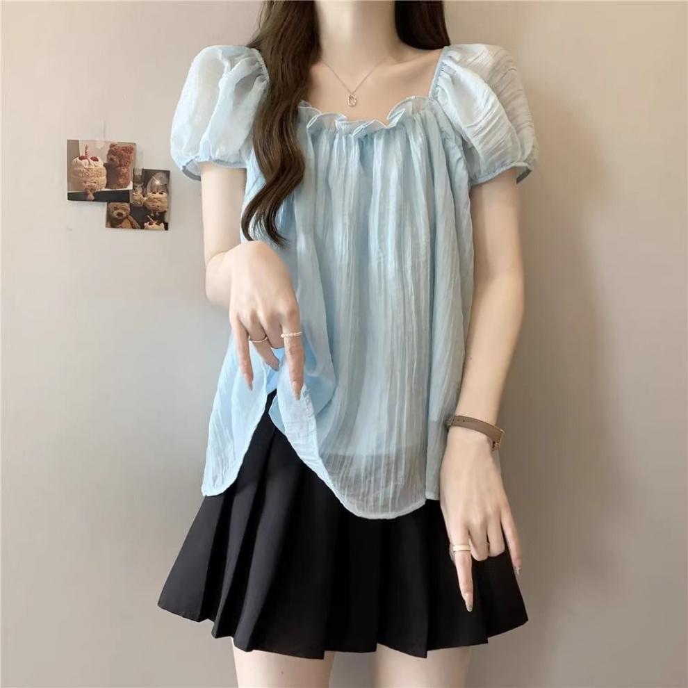 大きいサイズの婦人服の太ったmmの夏の薄い泡の袖のシフォンのシャツの上着の2025新型のヨーロッパの商品の小さいシャツは肉のシャツを遮ります