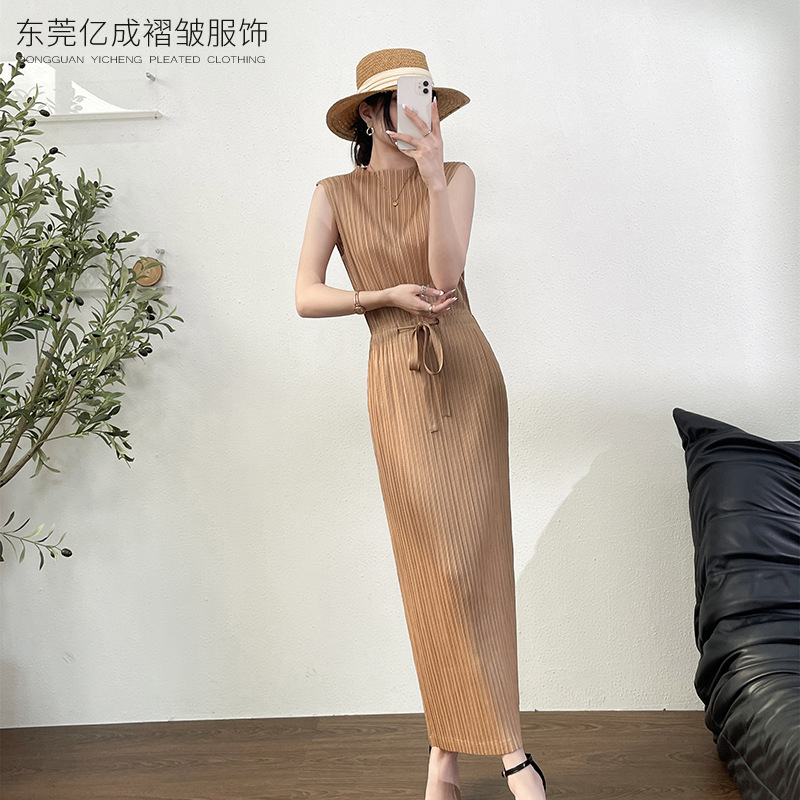 三宅褶皱半圆领系带无袖连衣裙简约修身显瘦打底背心裙一步长裙