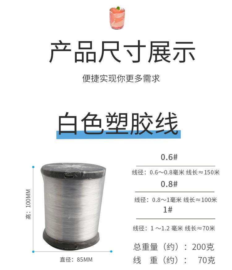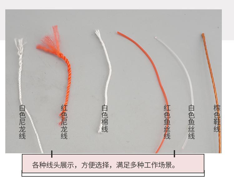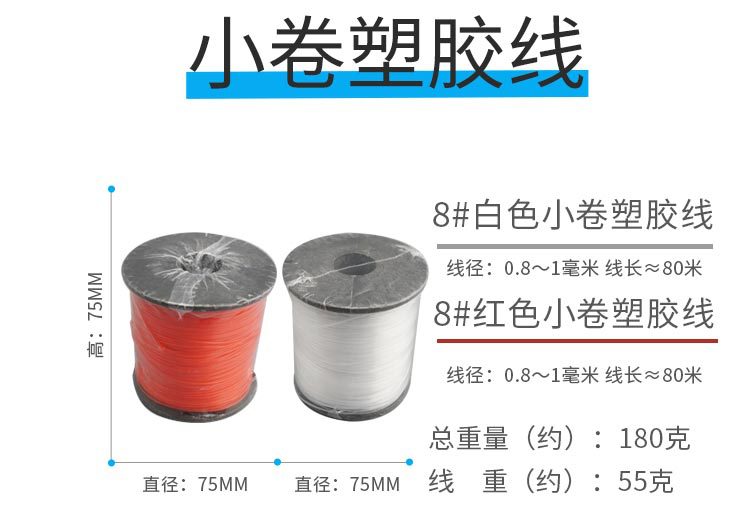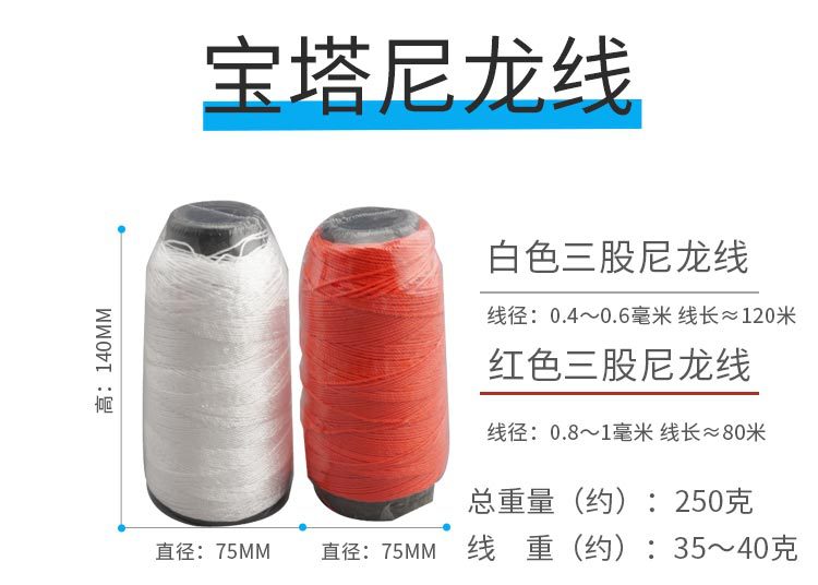仕様とモデル 白色プラスチックワイヤー0.6#1ロール,赤プラ線 0.6#1ロール,白いプラスチックワイヤー 0.8 # 1ロール,赤色プラスチックワイヤー 0.8#1ロール,白いプラスチックワイヤー 1#1ロール,赤いプラスチックワイヤー 1#1ロール,タイヤライン、シューライン(細) 1本,タイヤライン、シューライン(太) 1本,パゴダタイヤライン、シューライン(細)1本,パゴダ綿糸 4 本撚り 1 ロール,パゴダ白ナイロン糸 3 ストランド 1 ロール,パゴダレッドナイロン糸 3 ストランド 1 ロール