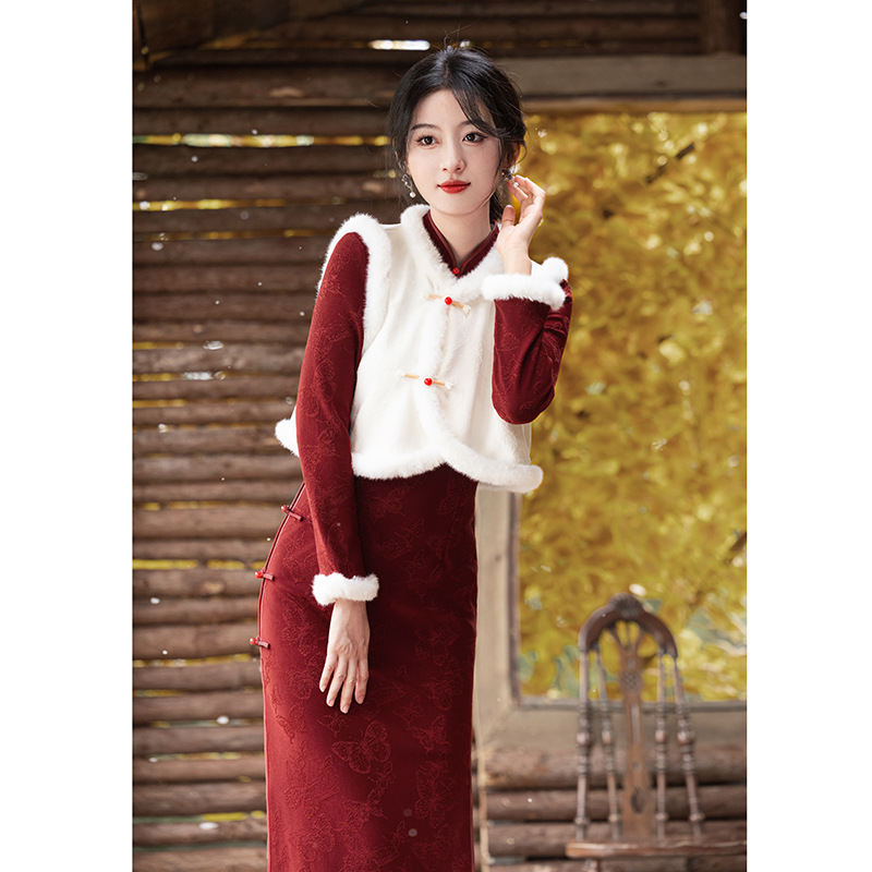 赤いチャイナドレス2024新作秋冬ベストセット新年の新年のお祝いの長袖の厚い日常のワンピースの女性