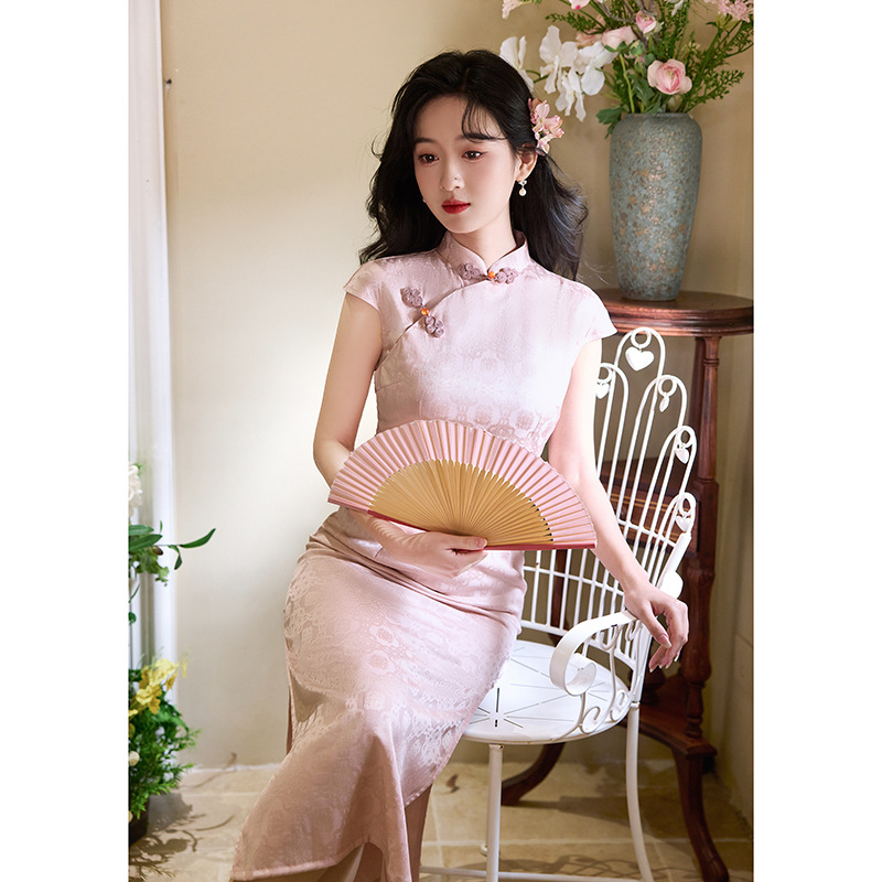 古法の伝統的なピンクのシルクのジャカードの開襟のチャイナドレス2025の新型の民国風の若い少女は地のワンピースを牽引します。