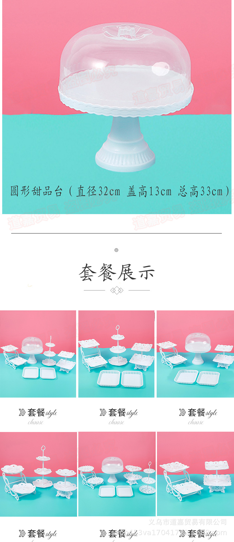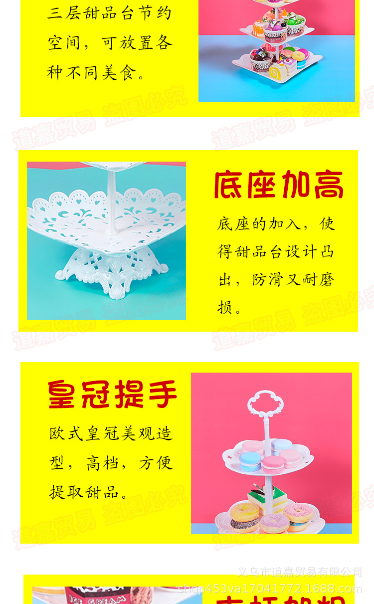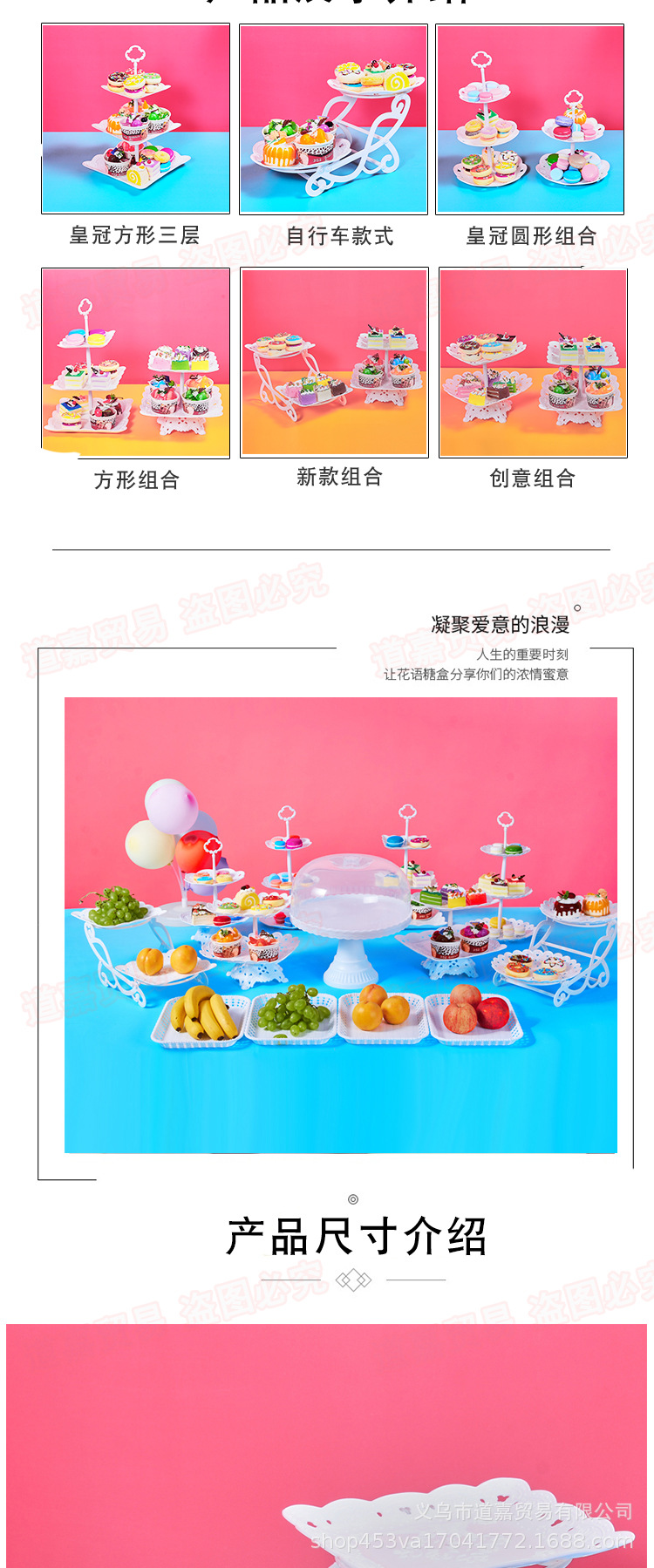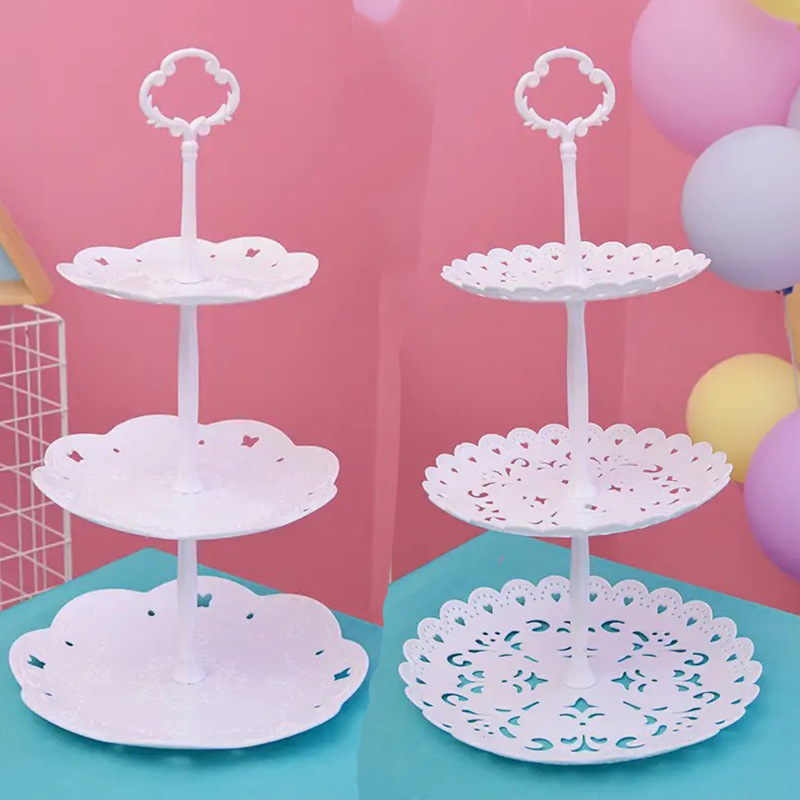 ヨーロッパ式のプラスチックの多層の果物の皿の客間のお茶のいくつかのキャンディーの皿の前のケーキの棚のトレーの3階のデザートの台の置物