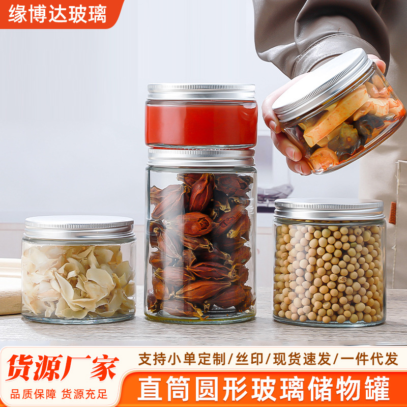 直筒型保存瓶 密閉透明ガラス 円形アルミ蓋 ガラス瓶 漬物瓶 ジャム瓶 缶詰瓶 防湿密封