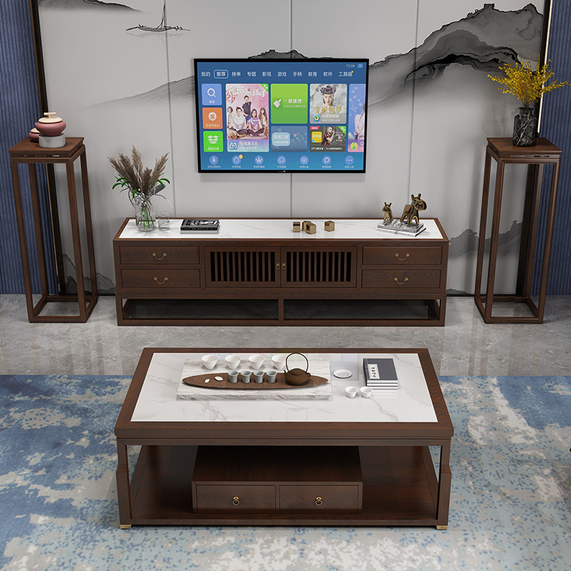 新しい中国風のアッシュ無垢材コーヒーテーブルテレビキャビネットセットロックボード映画キャビネットソファマッチングコーヒーテーブル禅家具