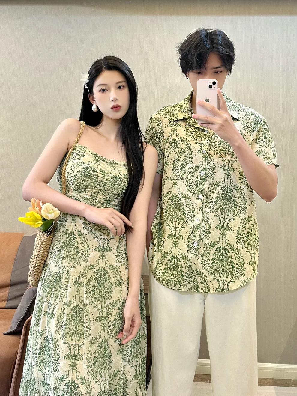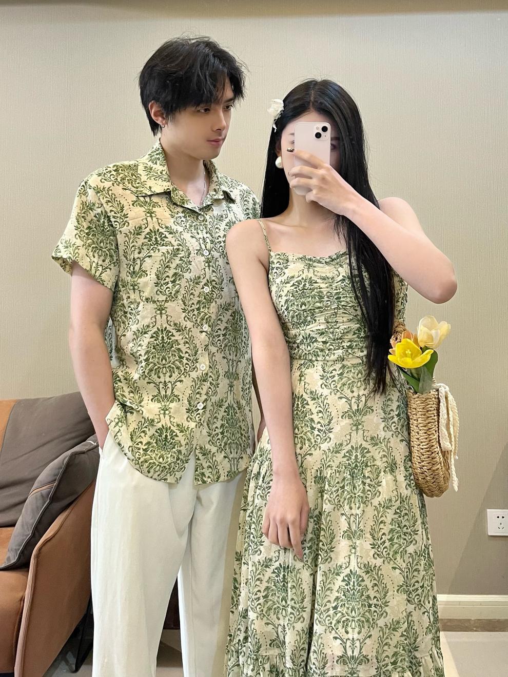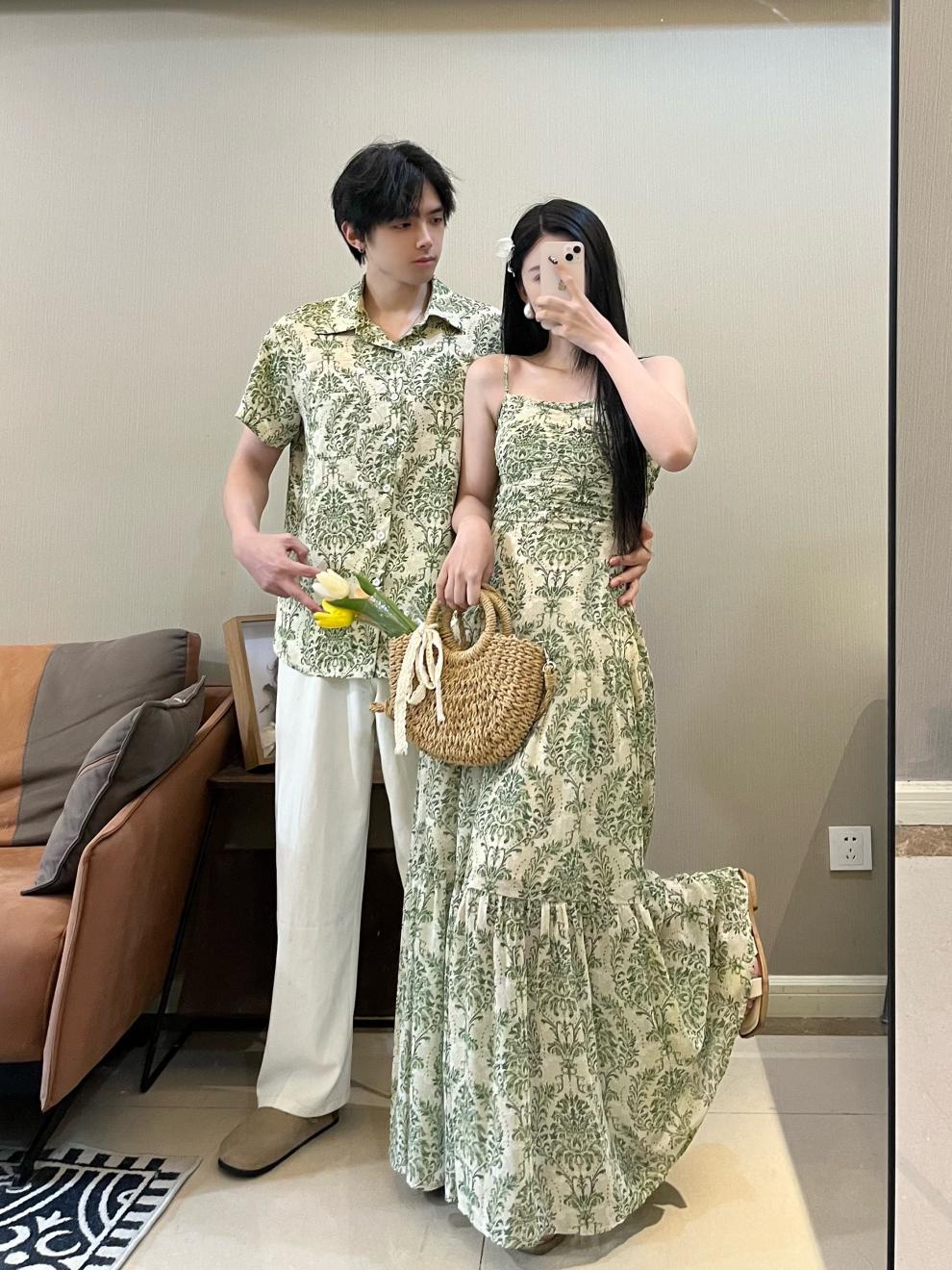 2023夏のカップル服半袖水墨プリント男性シャツ女性サスペンダースカートワンピースリゾート風ビーチ服