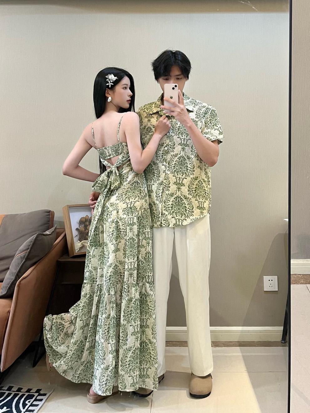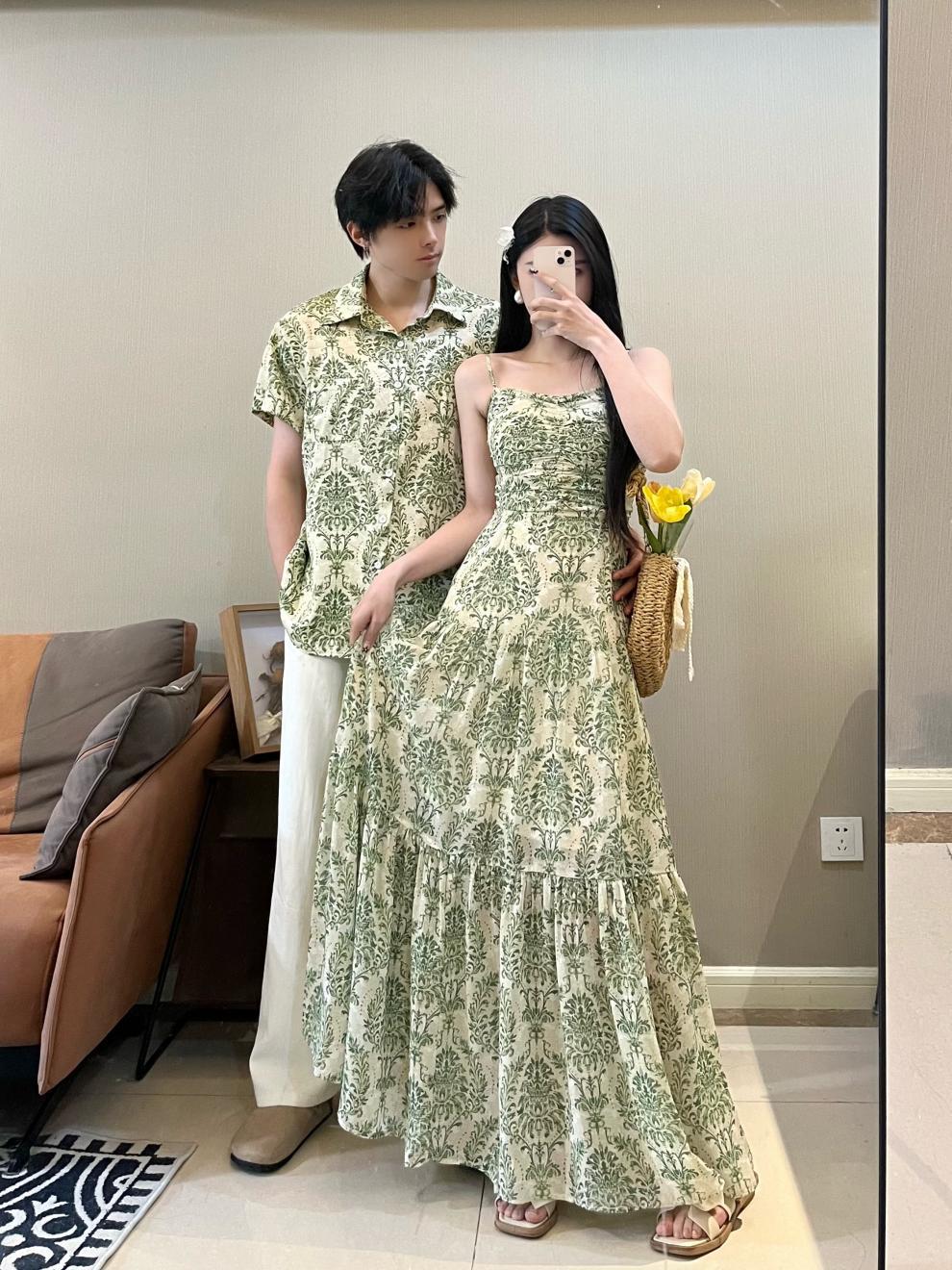 2025夏のリゾート風ストラップ気質ロングワンピース半袖男性シャツカップル服ビーチ服
