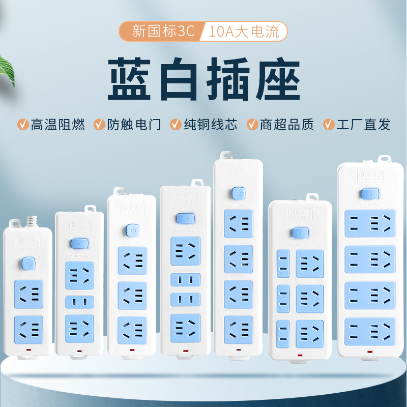跨境蓝白圆孔插座适配欧标插头多位插孔纯铜无线插板带线插板
