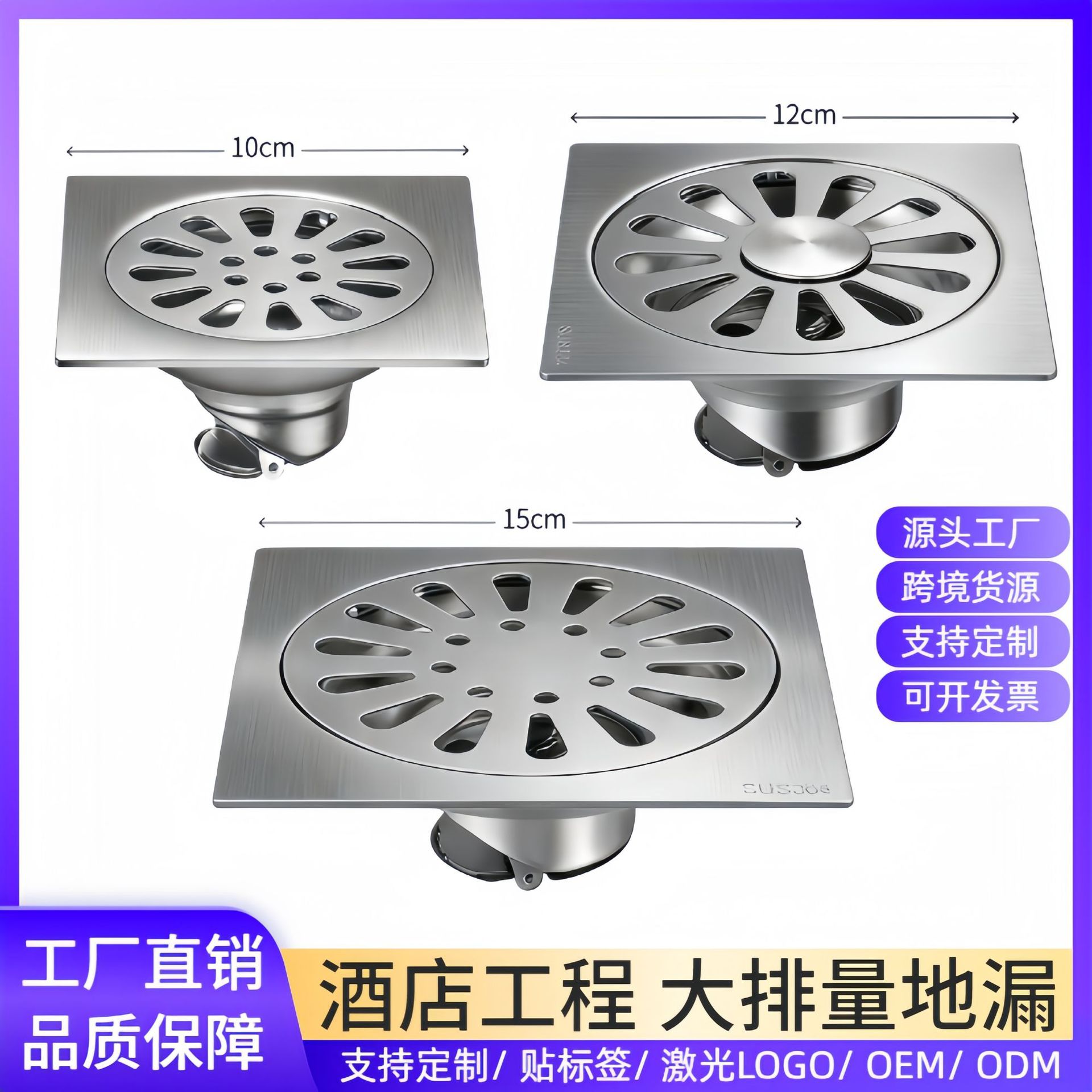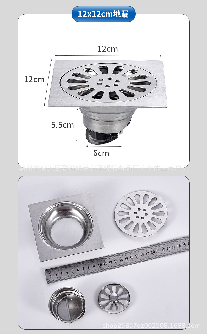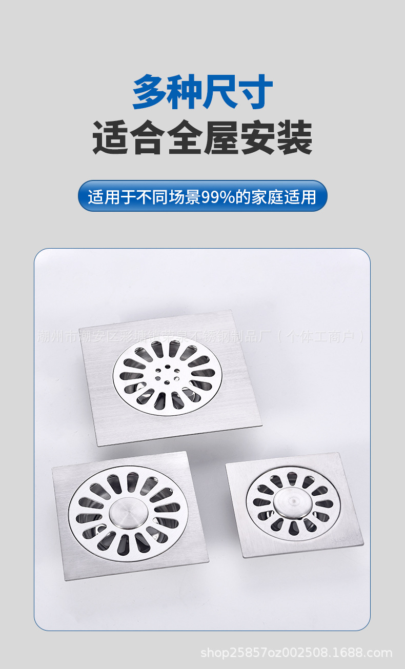 浴室用ステンレス製排水溝、正方形、ホテル、シャワールーム、トイレ、洗濯機排水管、防虫・防臭排水溝