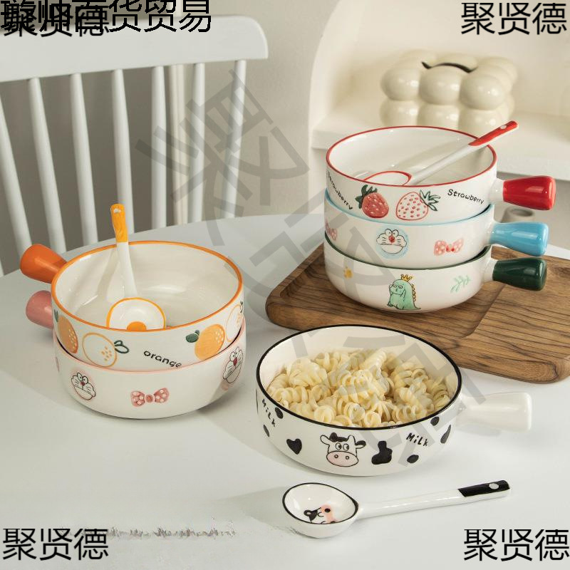 漫画かわいいセラミックハンドルボウル家庭用ハンドル付きベイクドライスボウルヨーグルトボウルクリエイティブフルーツサラダボウルデザートボウル
